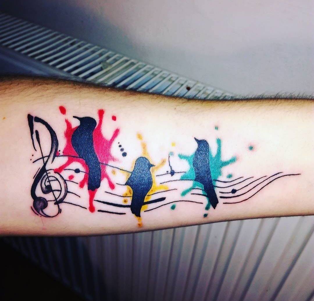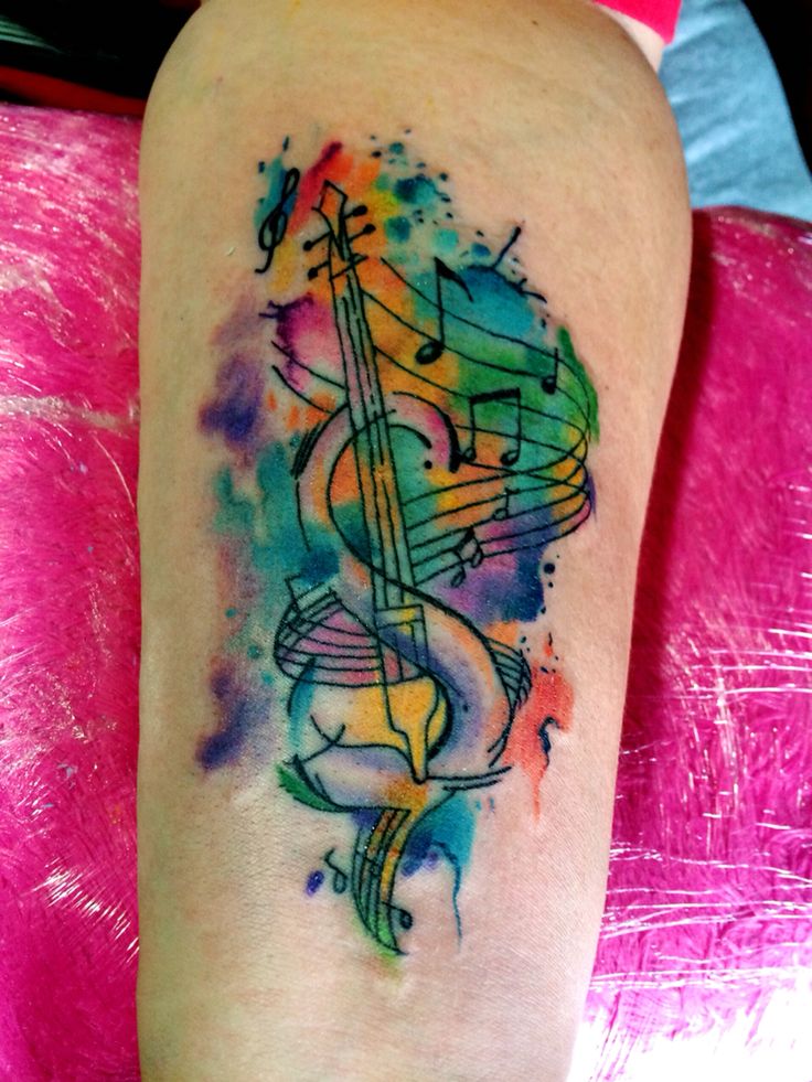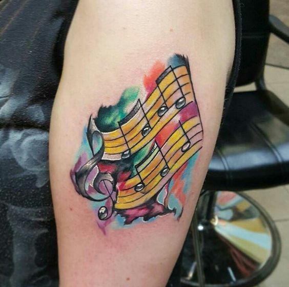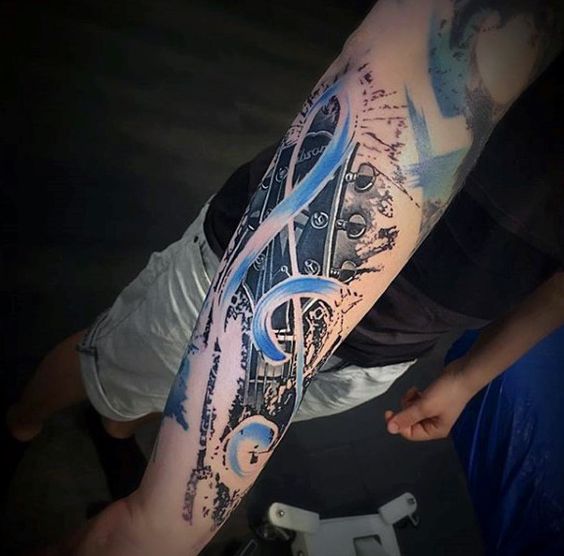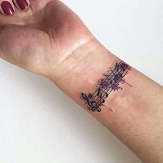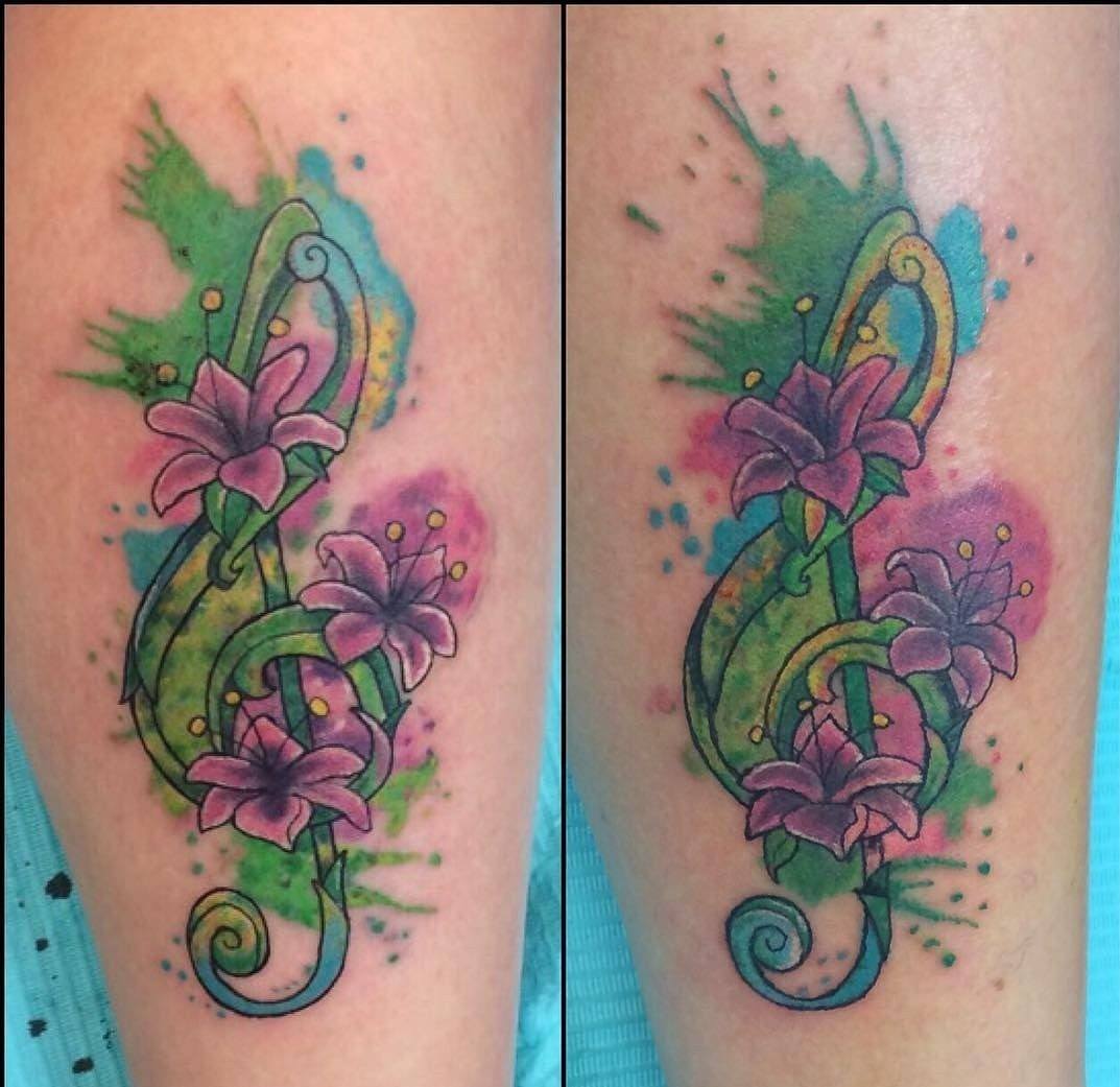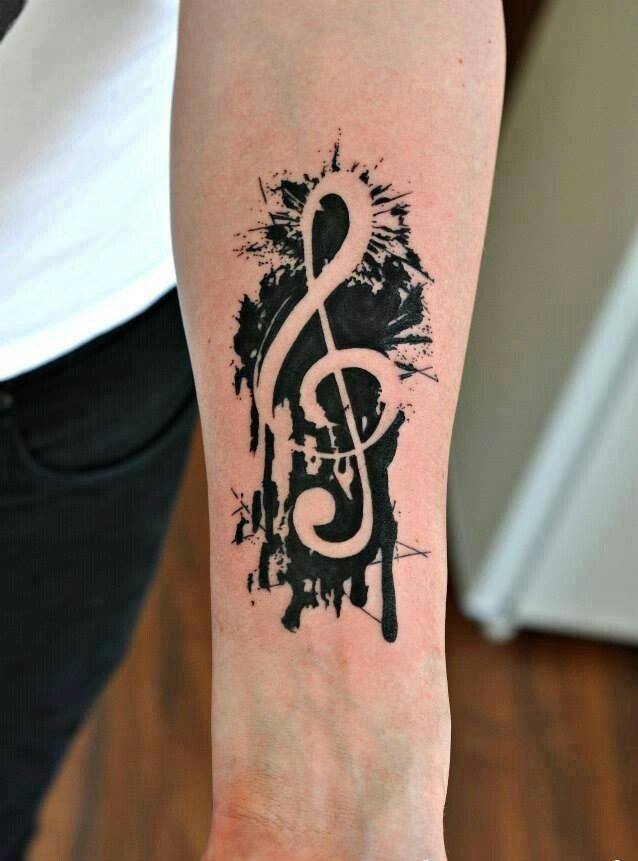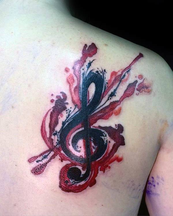 Le tatouage de la clé de sol dans le style de l'aquarelle est le plus souvent utilisé par le beau sexe. Complétant une telle image avec divers ajouts et en la réalisant dans une solution de couleur floue, le tatouage est vraiment attrayant. Le flou du dessin, tel un tatouage, appliqué avec des peintures à l'aquarelle, attirera certainement l'attention. Le plus important est de ne pas en faire trop avec les ajouts. La clé de sol est un motif complexe, complétez-le donc par de petits motifs.