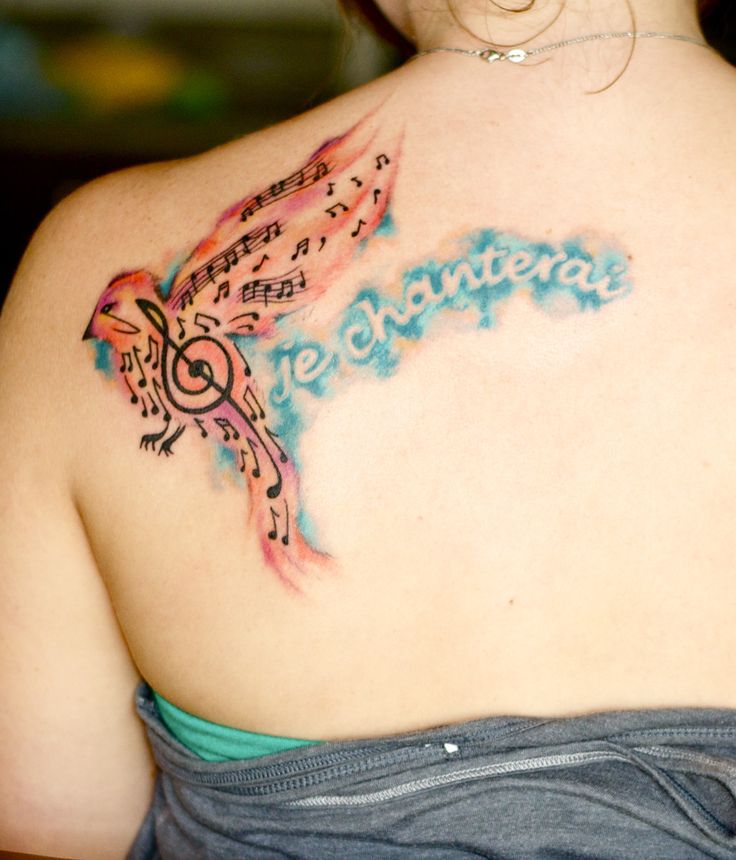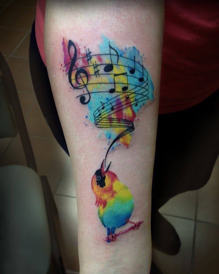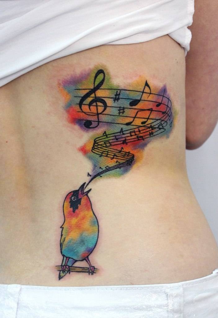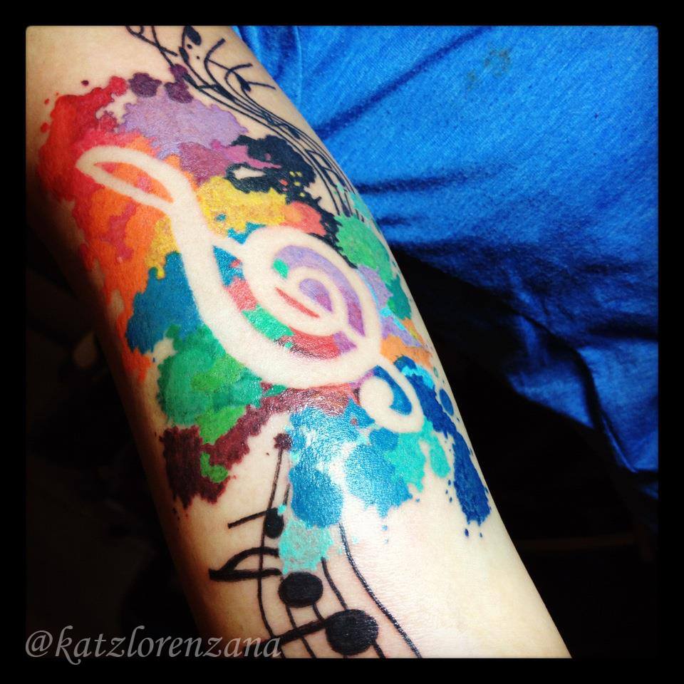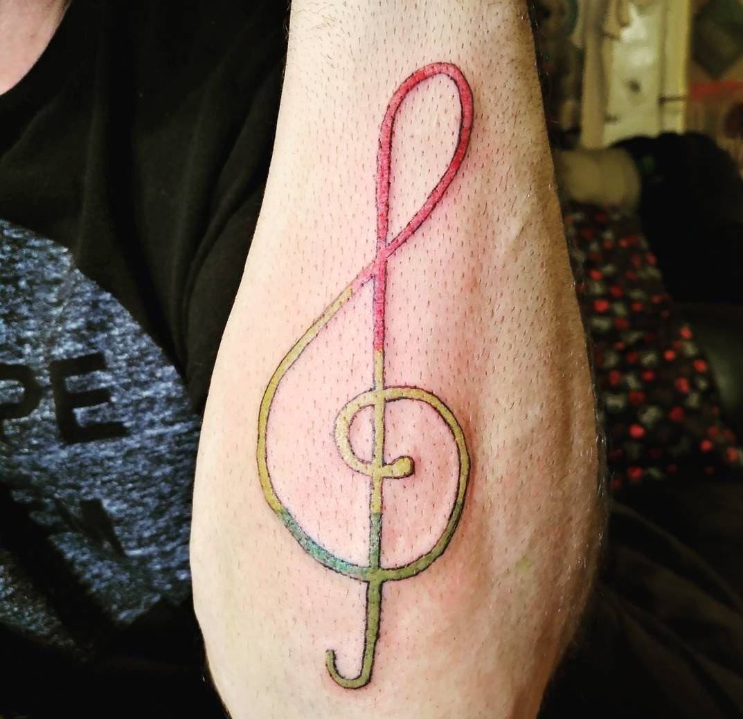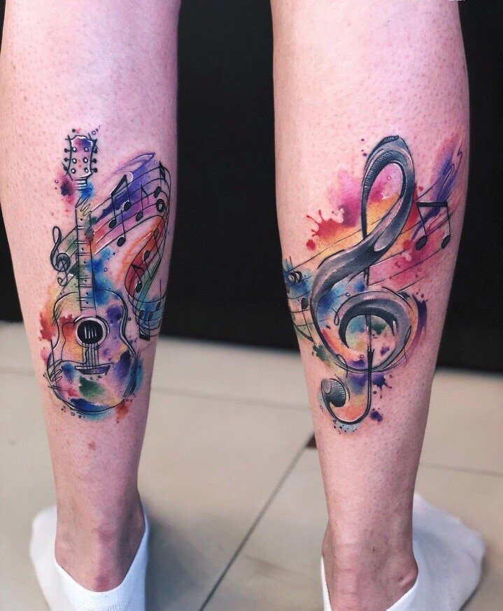 Le tatouage de la clé de sol dans le style de l'aquarelle est le plus souvent utilisé par le beau sexe. Complétant une telle image avec divers ajouts et en la réalisant dans une solution de couleur floue, le tatouage est vraiment attrayant. Le flou du dessin, tel un tatouage, appliqué avec des peintures à l'aquarelle, attirera certainement l'attention. Le plus important est de ne pas en faire trop avec les ajouts. La clé de sol est un motif complexe, complétez-le donc par de petits motifs.