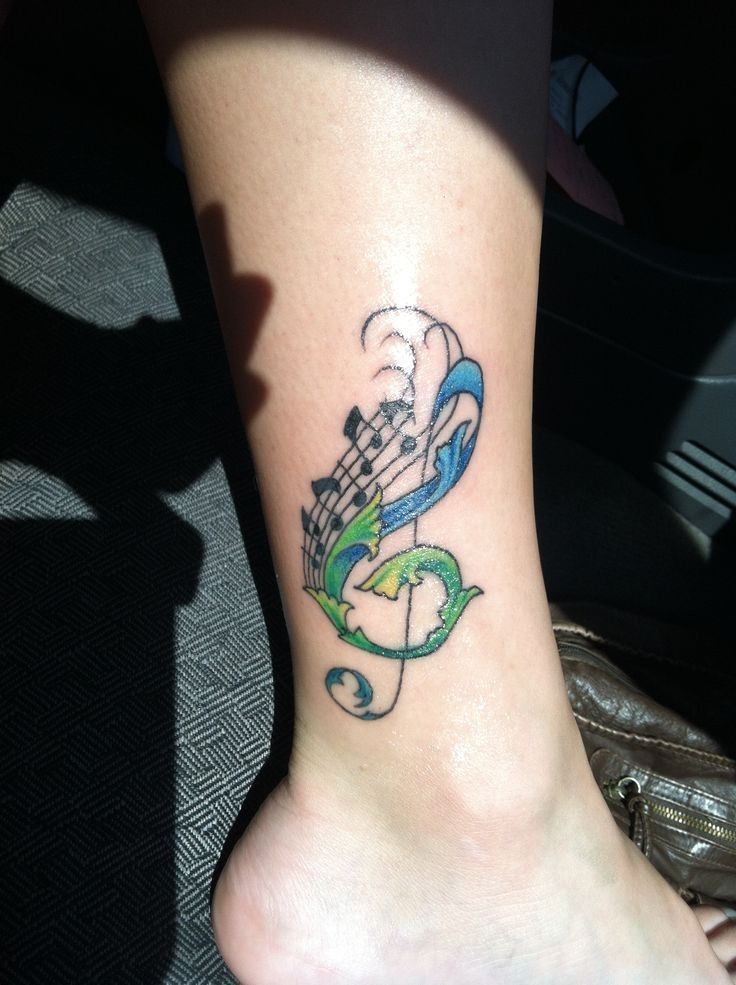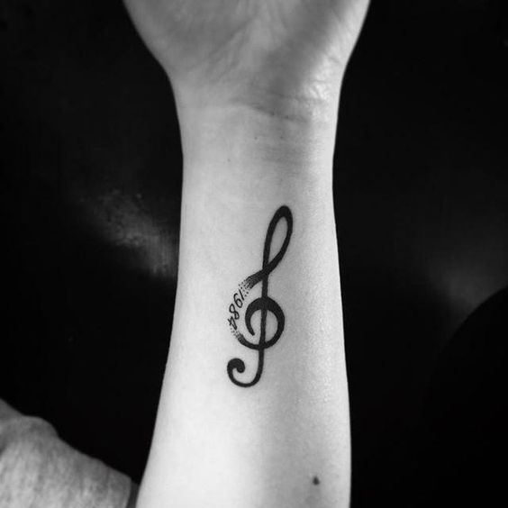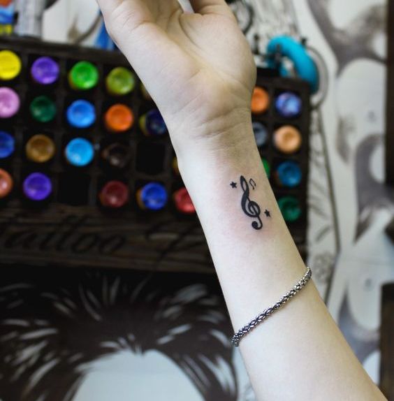 Les hommes et les femmes sont très populaires avec un tatouage miniature clé de sol. Ils essaient de placer une telle image miniature sur le doigt, derrière l'oreille ou le cou. Une mini image d'une portée avec des notes et une clé de sol au poignet ou à la cheville sera attrayante. Dans ce cas, l'image peut être réalisée sous la forme d'un bracelet original.