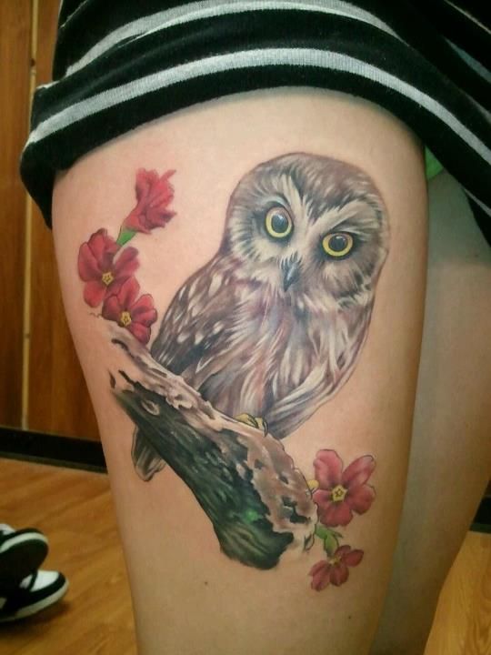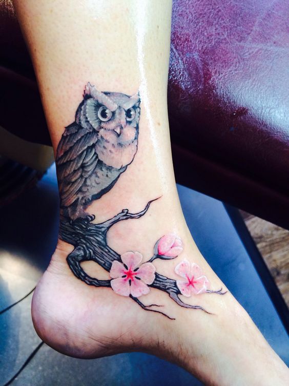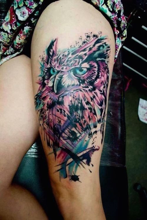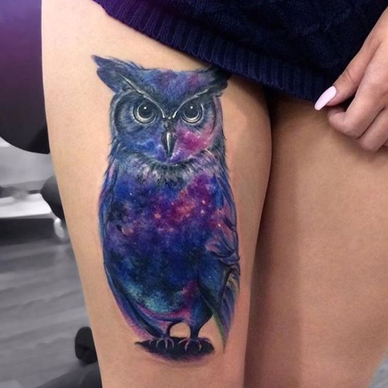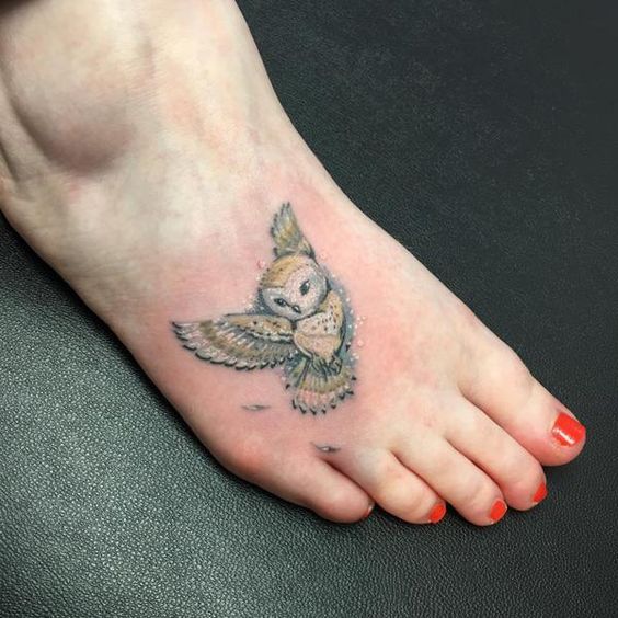 Les tatouages de hibou sur la jambe féminine sont très souvent effectués sur la face antérieure de la cuisse. De telles compositions ont l’air assez ambitieuses et tentent donc de les jouer en couleur. Mais même au niveau du mollet, de la cheville, de la jambe et du pied, les tatouages de hiboux colorés sont incomparables et originaux. Les hommes choisissent rarement leurs pieds comme endroit où placer le mystérieux oiseau.