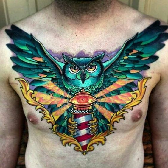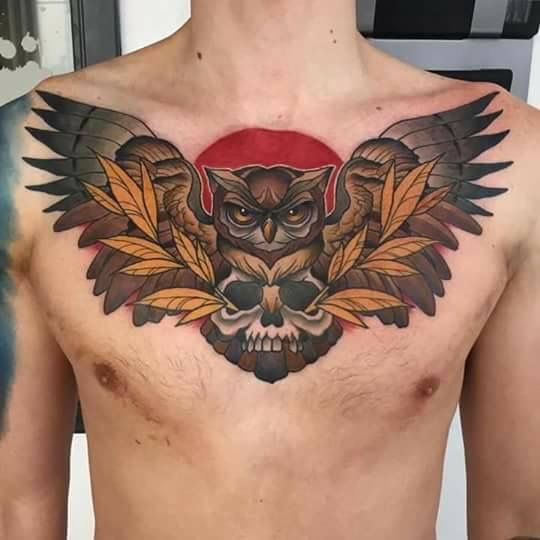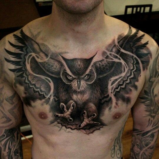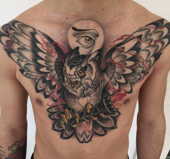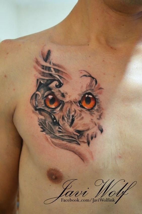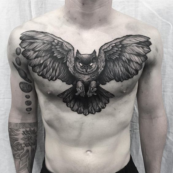 Tatouage de hibou sur la poitrine: exemples uniques sur la photo