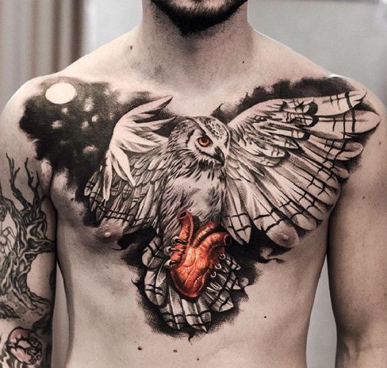 Selon les hommes modernes, le tatouage d'un hibou sur la poitrine devrait être tellement réaliste et volumineux qu'il vous coupera le souffle de la beauté d'une composition à part entière. Les hommes avec un tel tatouage peuvent être décrits comme décisifs, avec un esprit fort et une volonté libre.