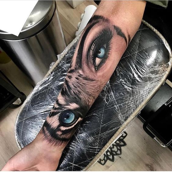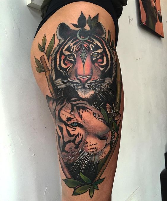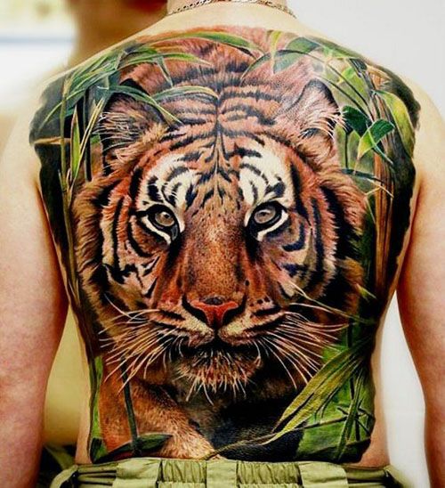 Chaque personne a son propre point de vue sur les tatouages. Quelqu'un aime les tatouages en noir et blanc, et quelqu'un préfère les jolis dessins colorés. Par conséquent, les maîtres des salons de tatouage proposent de faire des tatouages en forme de tigre sur des arrière-plans colorés qui serviront d'excellente décoration. Par exemple, des nuances de terre et de ciel (fond vert et bleu) ou d'ornement floral.