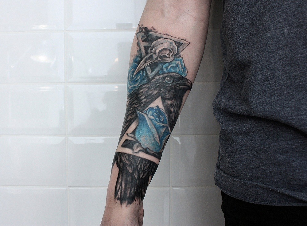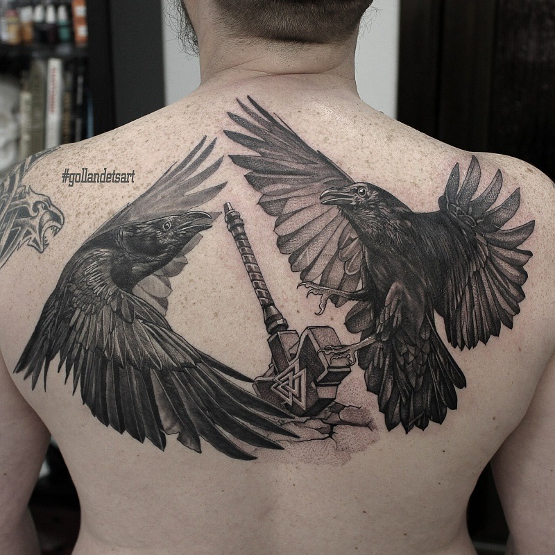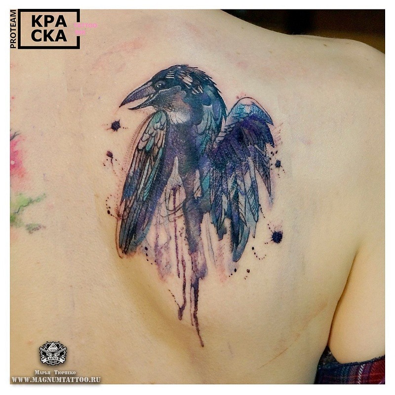 Dans le monde des tatouages, l'image d'un corbeau peut avoir différentes significations. Ces tatouages ont été utilisés par les Grecs et les Celtes. Un tatouage en forme de corbeau représentait presque toujours l'énergie éolienne, la sagesse et la longévité. Parmi les Japonais, cet oiseau symbolisait une famille heureuse, les Égyptiens, au contraire, considéraient le corbeau comme un oiseau du mal, de la destruction et du chaos. Des tribus africaines adoraient cet oiseau, le qualifiant de guide, et tuer un corbeau signifiait jeter un sort sur toute la tribu. Dans le christianisme, le corbeau est ambigu. D'un côté, un corbeau noir est un oiseau aux pouvoirs ténébreux, et de l'autre, un corbeau a sauvé le prophète Elijah de la famine. La solitude et la sagesse sont un autre sens du tatouage de corbeau. Aujourd'hui, le tatouage en plumes de corbeau est devenu un symbole du rock. Ce tatouage est appliqué sur le dos ou l'épaule.