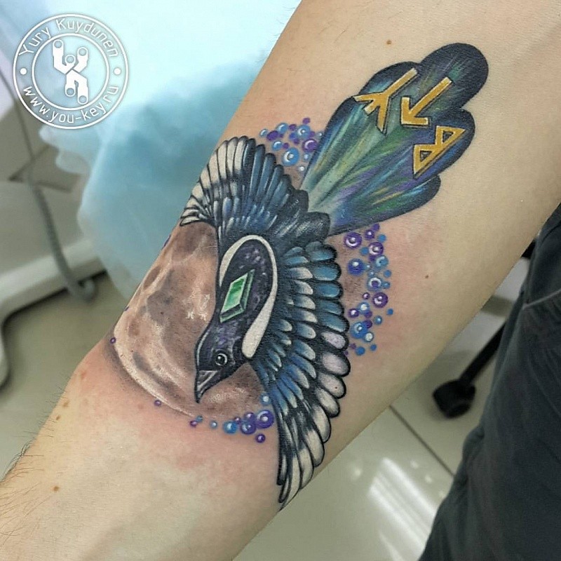 Séparément, il convient de noter les tatouages représentant un corbeau blanc. Pour comprendre la signification d'un tel tatouage, vous devez vous tourner vers le concept de cette phrase. Bien qu'il y ait des oiseaux albinos blancs dans la nature, le concept de «corbeau blanc» a son propre concept. Dans la société, cela s'applique aux personnes qui sont exclues de la masse, aux parias et à celles qui ne veulent pas se plier aux habitudes et aux fondements de la vie. Un tatouage représentant un corbeau blanc est donc appliqué par les personnes qui considèrent cet oiseau comme un indicateur de leur position dans la vie, même au détriment de leur bien-être matériel et de leur socialisation.