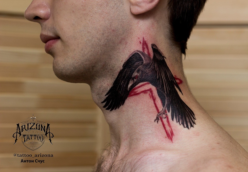 Le tatouage corbeau sur le cou est original et attrayant. La meilleure image sera perçue si elle est faite dans le style graphique ou minimalisme dans une seule couleur.