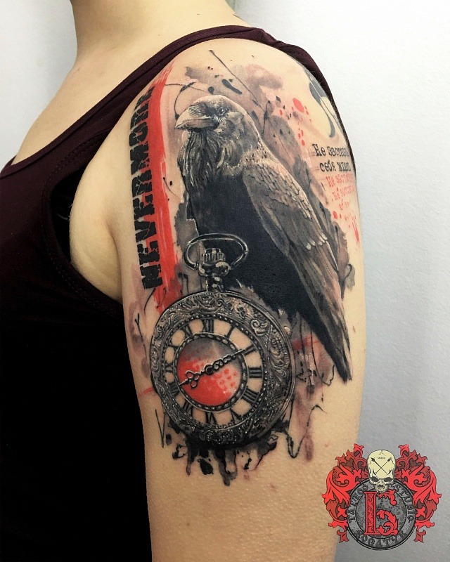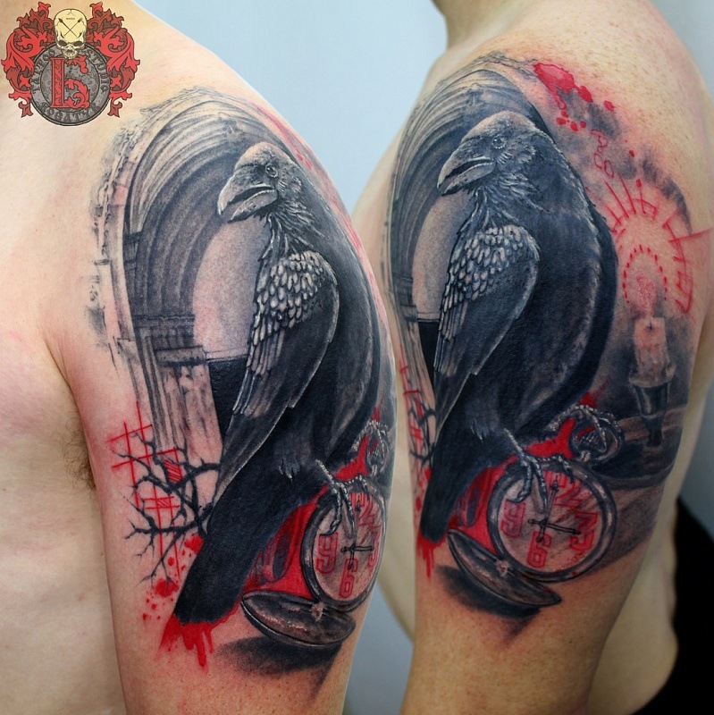 L'épaule est un autre endroit populaire pour les tatouages corbeau. Bien sûr, la zone est petite, mais un tatouage avec une petite image aura fière allure ici. Très souvent, un tatouage de corbeau sur l'épaule peut être trouvé chez les femmes d'âges différents. Ce n'est pas pour rien qu'ils disent que chaque femme est une petite sorcière dans son âme.