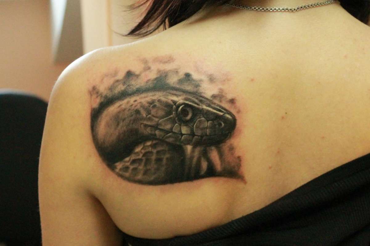 Le tatouage sur les épaules avec le serpent est très impressionnant. C'est dans cette zone que l'emplacement d'un tatouage spectaculaire indique la sagesse du propriétaire. Les serpents gracieux et rusés sont généralement de taille moyenne et complétés par une intrigue réaliste.