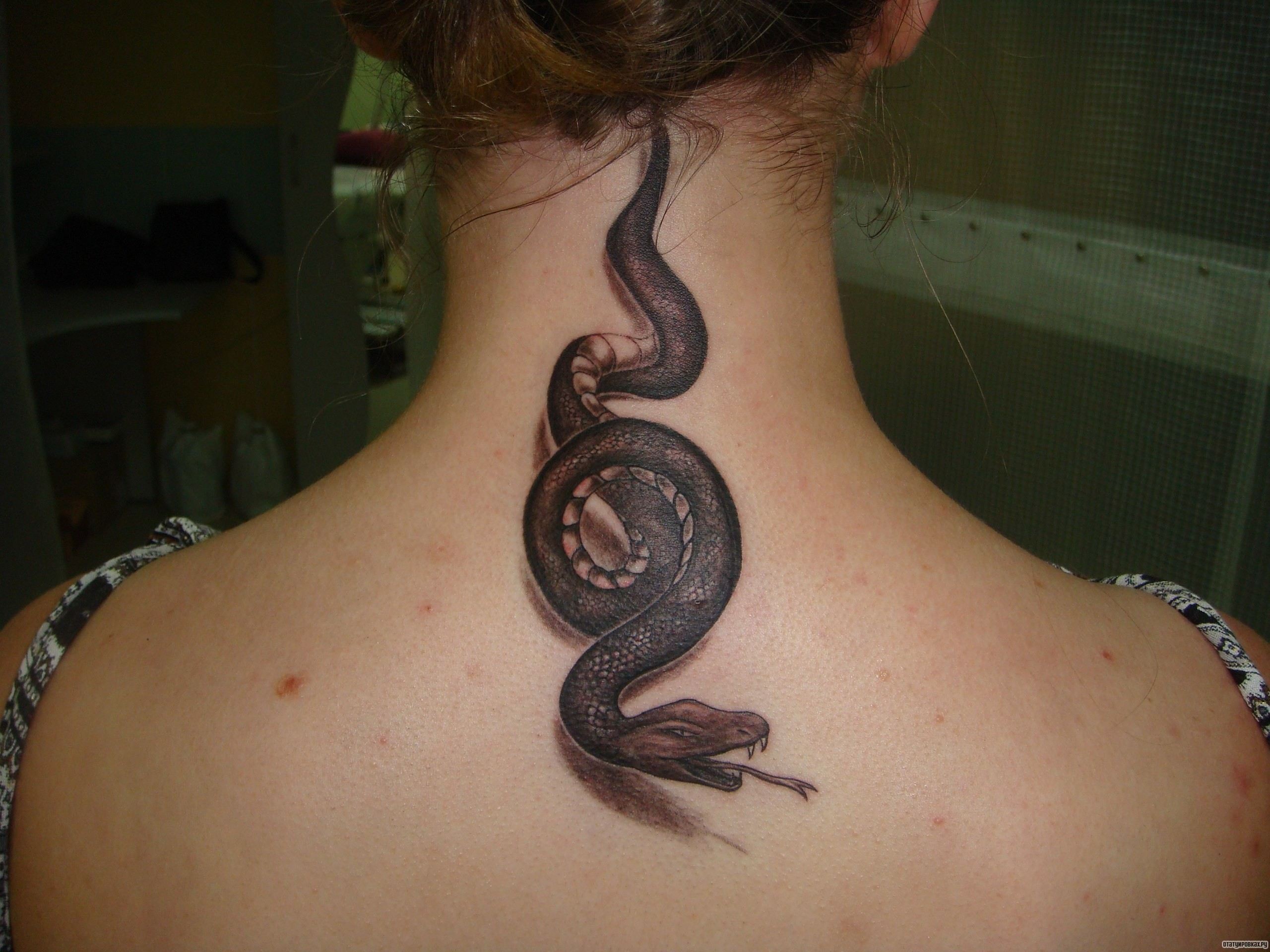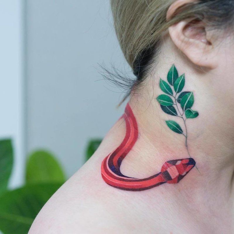 Un tatouage sur le cou en forme de serpent peut littéralement enrouler cette partie du corps en cercle, comme si vous étouffiez. Seules des personnes sans peur peuvent probablement se permettre d’avoir un tel tatouage dans un lieu aussi dégagé. Les femmes préfèrent appliquer des tatouages de serpents à partir de la nuque, à partir desquels le maximum visible à l'avant est la tête ou la queue d'un prédateur.