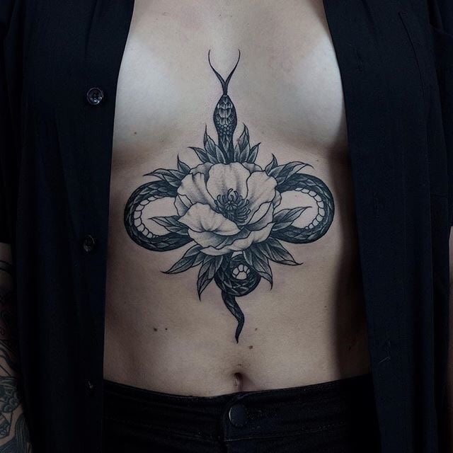 La vie au paradis, l’harmonie avec soi-même et le monde qui nous entoure - c’est ainsi que s’interprète la composition pectorale avec des fleurs, autour de laquelle un serpent est enveloppé. Un serpent caché dans une fleur contient une énigme spéciale. En regardant un tel tatouage, vous commencez à vous demander si cet animal à sang froid va attaquer ou tout simplement se prélasser paisiblement au soleil, se balançant doucement sur un tronc de fleur.
