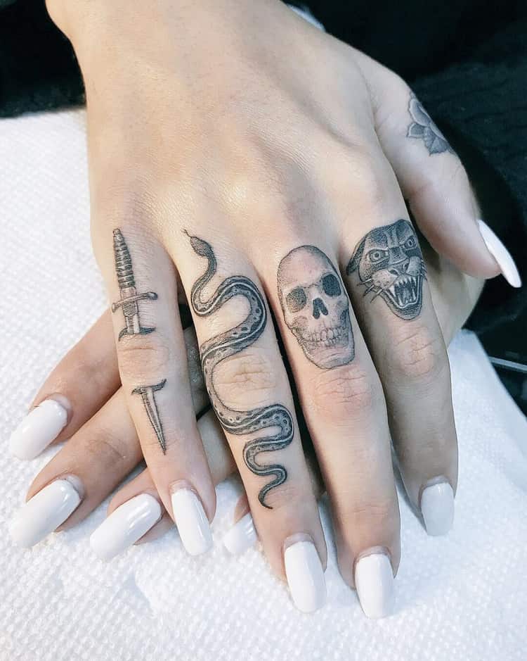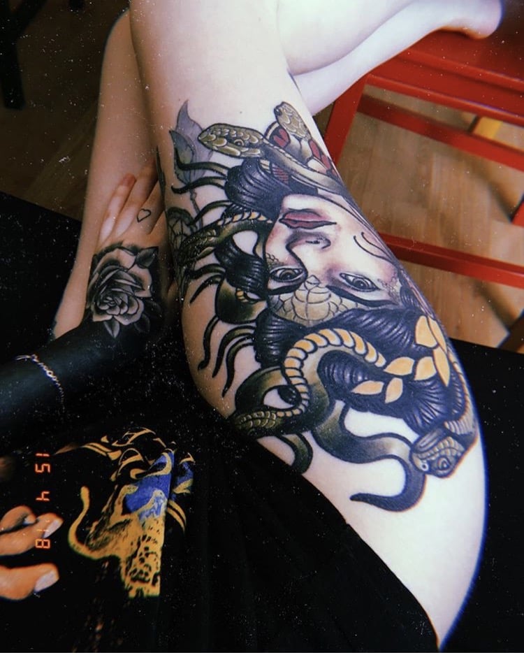 En dépit de certaines agressions dans le comportement de nombreux serpents, les hommes préfèrent utiliser son image comme dessin principal dans la composition corporelle globale. Souvent, vous pouvez voir sur le corps masculin un serpent rampant à travers un crâne humain. Une autre option masculine populaire était l'image de la méduse Gorgon, dans laquelle les cheveux sont des serpents.