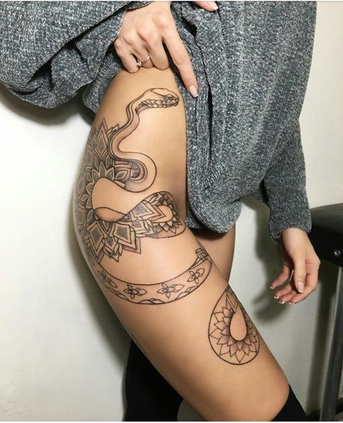 Sur la jambe sont représentés non seulement un mini-format d'un tatouage de serpent, mais également des images entières à grande échelle avec des détails de dessin supplémentaires. Au niveau des cuisses, les maîtres se permettent une promenade et remplissent la fille de quelque chose d'unique et d'individuel. Beaucoup de tatouages de serpent sur les jambes sont assez créatifs.