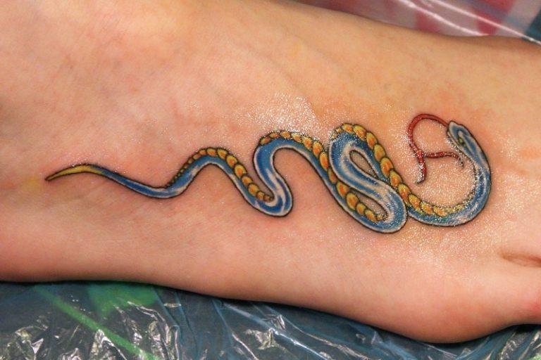 Ainsi, le tatouage d'un serpent à la peau renouvelée symbolise la résurrection, la renaissance et la jeunesse. Un tel tatouage caractérise le propriétaire comme une personne qui a radicalement revu sa position dans la vie. Un symbole de constance, d'infini et d'éternité est un tatouage circulaire pectoral, où un serpent avale sa queue. Les serpents de feu sont synonymes de prospérité et le cobra est généralement considéré comme un dessin des déesses.