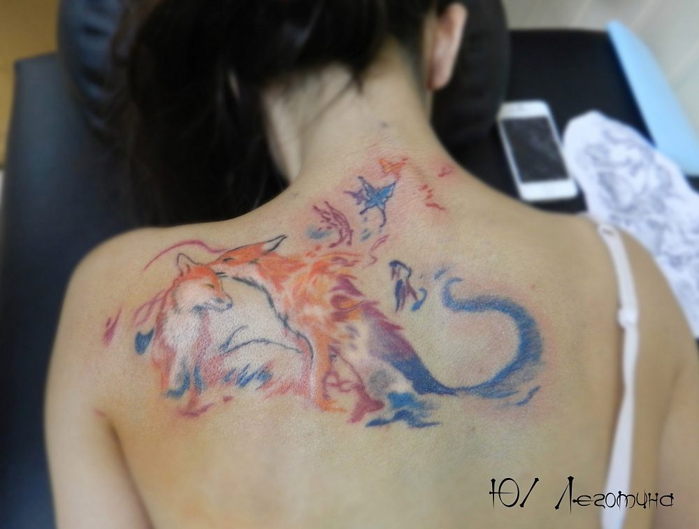 Les tatouages à l’aquarelle donnent au maître l’occasion d’exprimer son extraordinaire talent créatif. Ces ornements ont un joli look coloré, délicat et mignon. Le style aquarelle confère au tricheur rouge un chic extraordinaire, attirant ainsi l'attention. Mais il convient de noter que tous les maîtres de tatouage ne seront pas en mesure d'appliquer correctement un ornement. Après tout, ce style de tatouage nécessite une approche plutôt scrupuleuse.