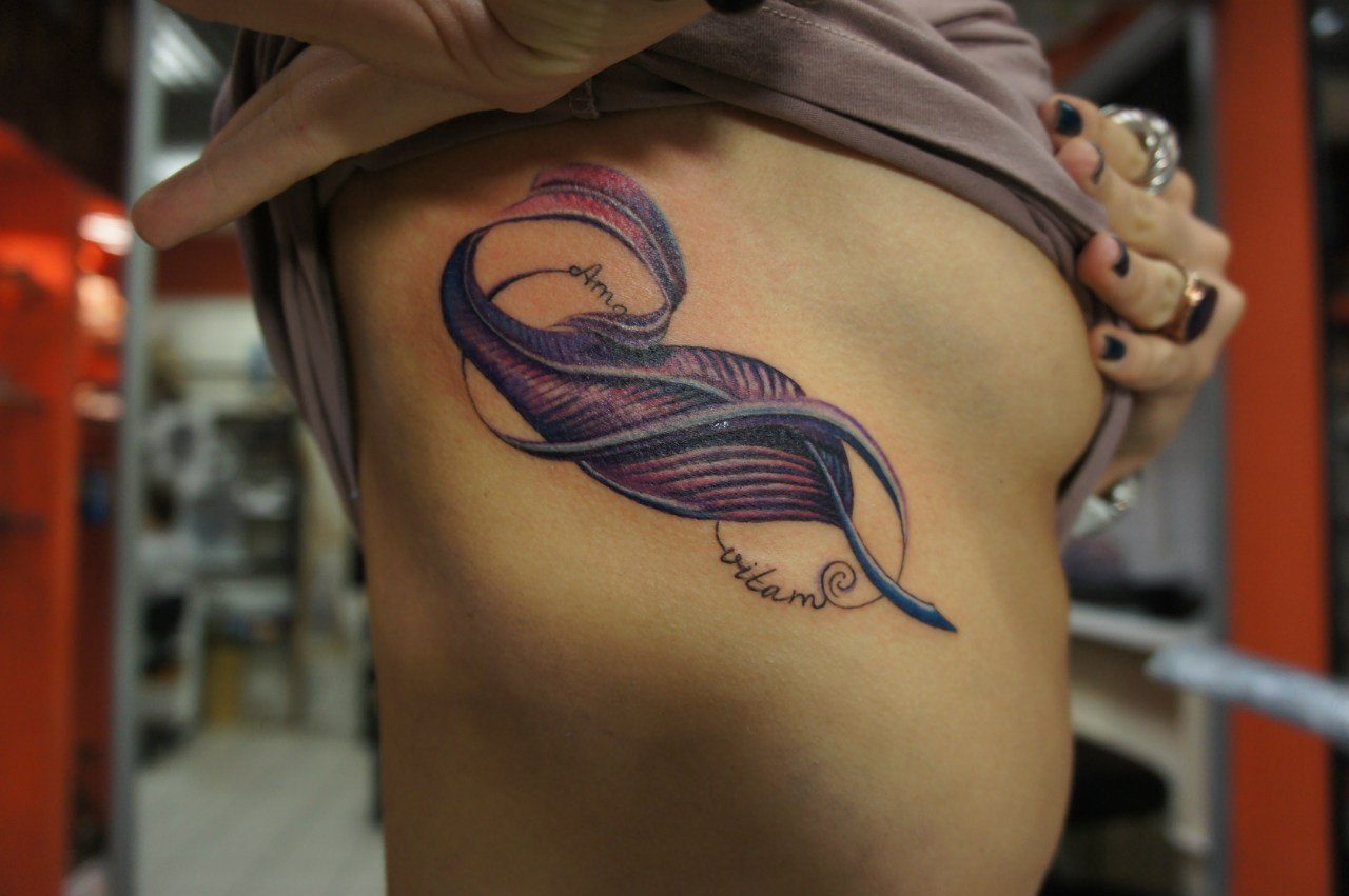 Le tatouage sur les côtes sera beau et beau devant et derrière. La condition principale est qu’il soit en harmonie avec le reste du tatouage existant. Le tatouage peut commencer directement sur les côtes et se déplacer doucement vers le ventre, le dos, les hanches et les fesses. De quel côté le tatouage sera localisé n'a pas d'importance. Mais si vous choisissez une mascotte de tatouage, le choix du côté de l’image présente certaines limites. Selon les règles religieuses, le côté gauche est un symbole du mal et de la négativité, tandis que la droite symbolise le bien et la force. Mais toutes les règles ont leurs exceptions. Par exemple, l'image d'un dauphin sur le côté gauche indique la fidélité et la dévotion. Tatouage Yin-Yang sur le côté droit - symbolise la sagesse et la capacité de résoudre tous les mystères du destin.