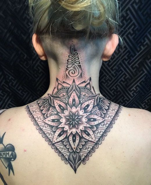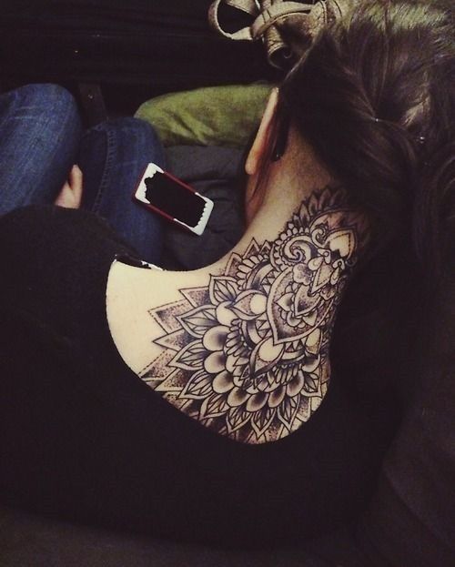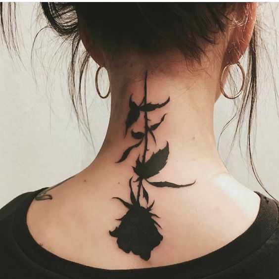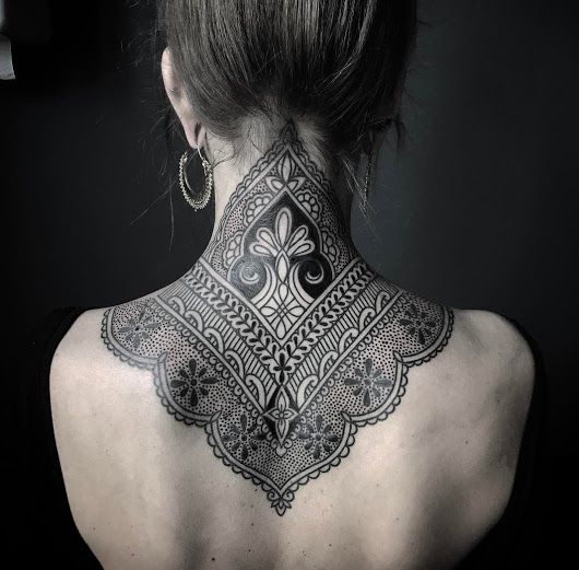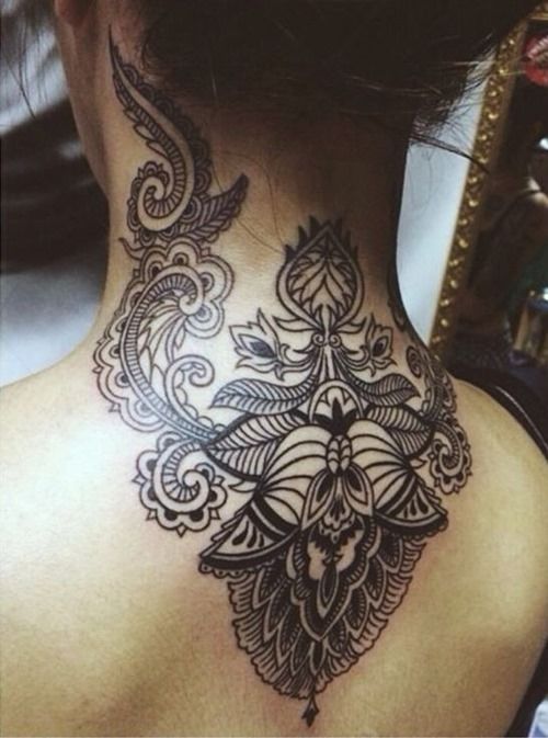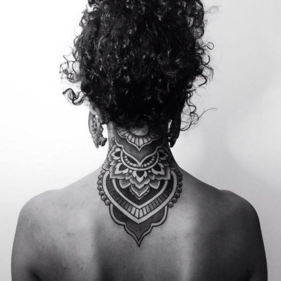 Les filles rebelles préfèrent des dessins plus impressionnants pour l'art corporel. La taille d'un tel motif peut être déterminée par l'intervalle entre le haut de la tête et la clavicule. Dans cette optique, il existe un immense espace pour l’incarnation de la pensée créatrice. Par conséquent, le choix des dessins est si vaste: créatif, scandaleux, à la mode, volumineux pour un cou féminin élégant.