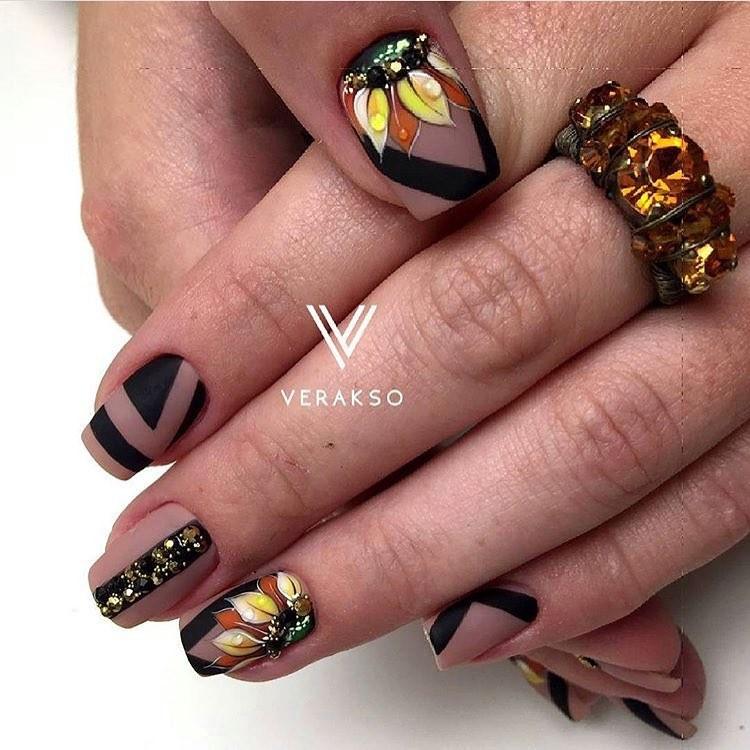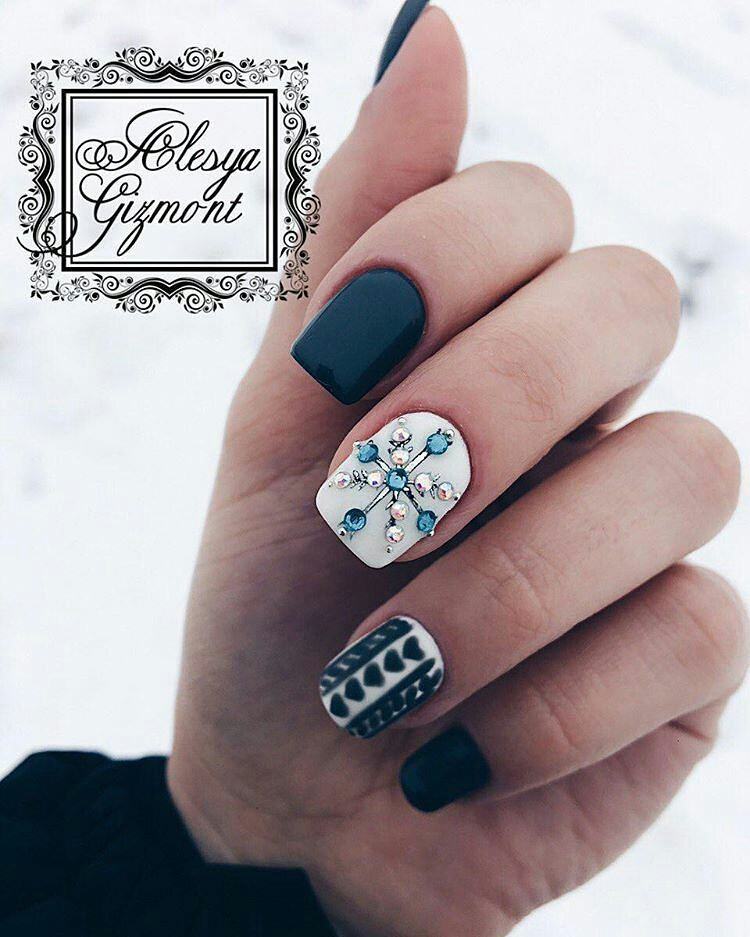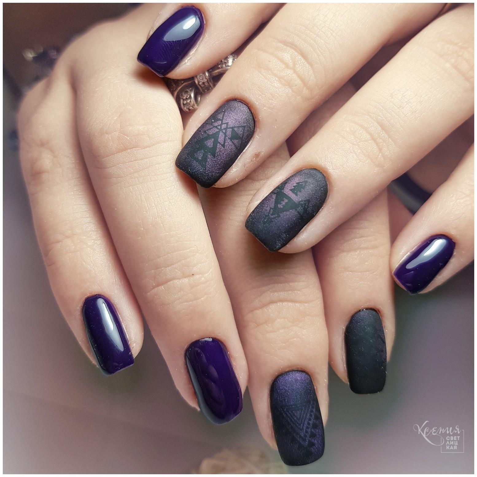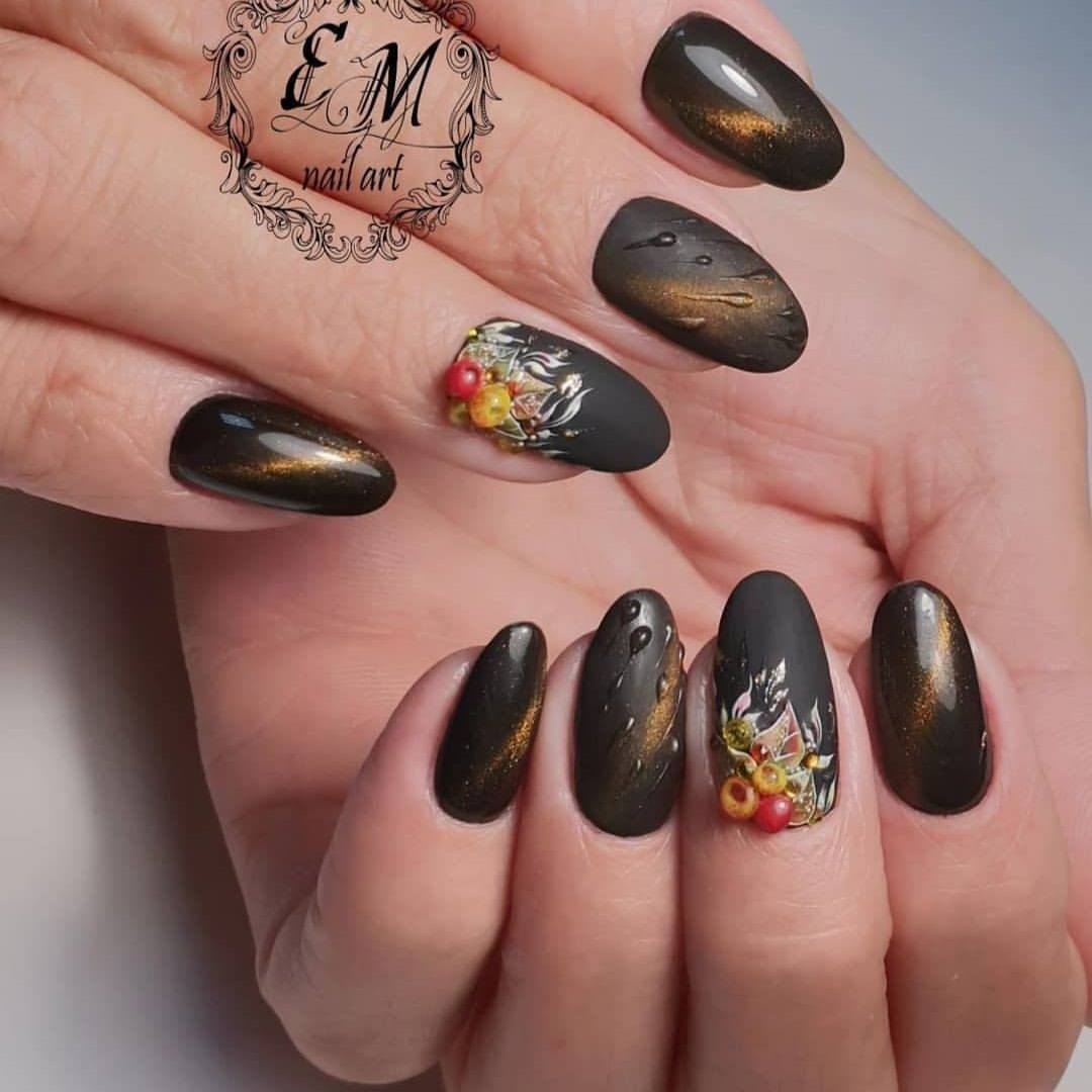 Tout revêtement sombre, qu'il soit noir, bleu, bordeaux ou de toute autre teinte, a l’air très riche, avec un dessus mat et de petites étincelles ou strass. Charme sera un dessin sombre dans un dégradé utilisant des paillettes, avec une bande de kamifubuki, ou une impression sous forme de peinture des ongles.