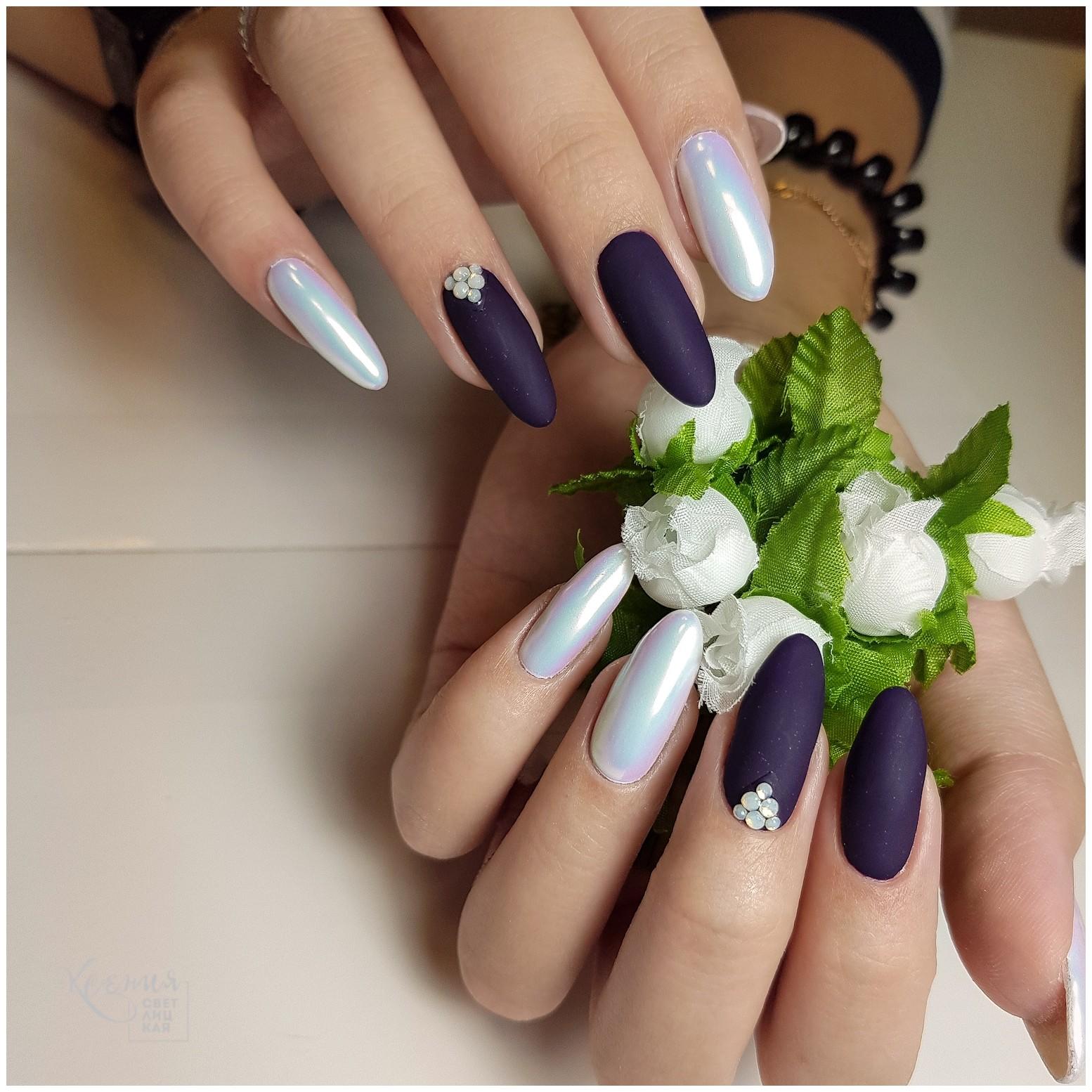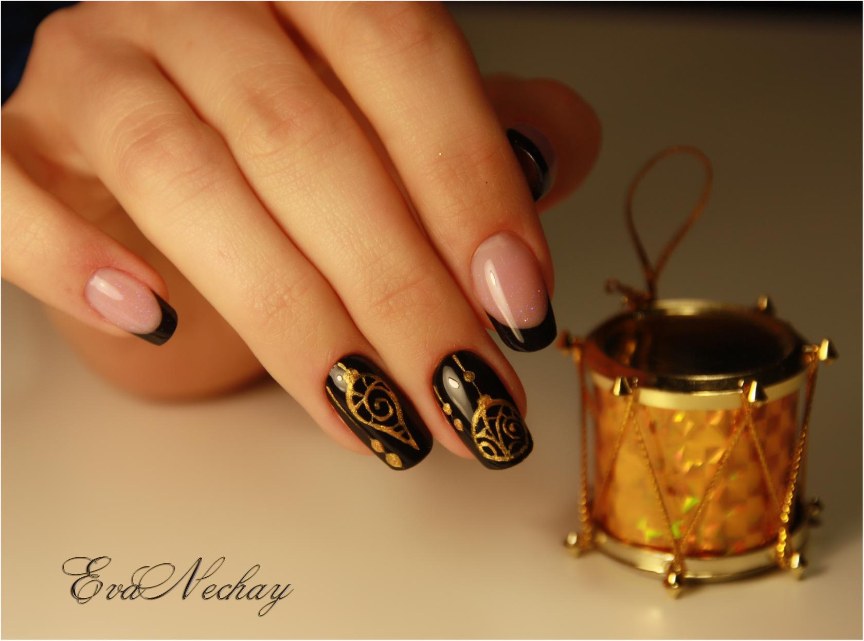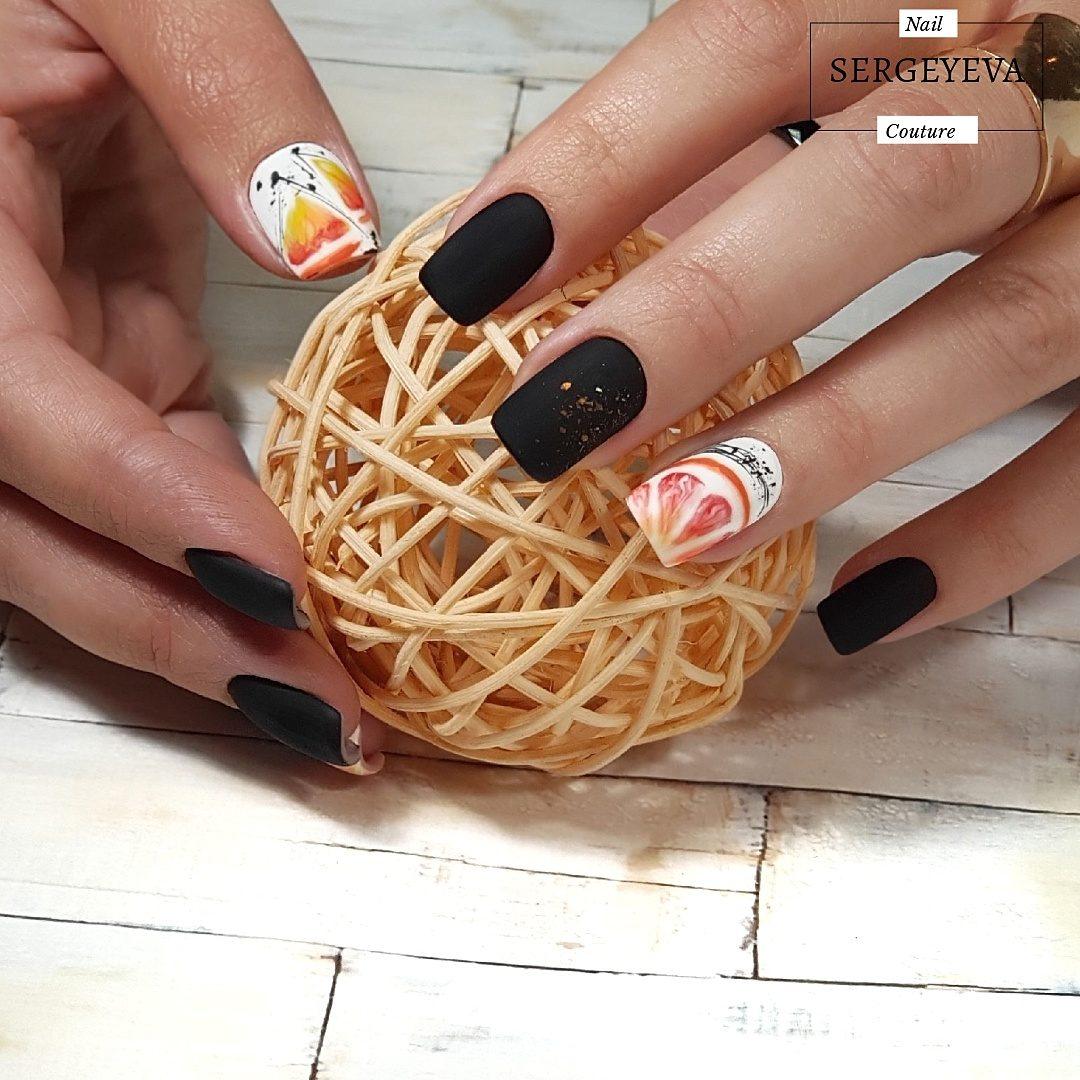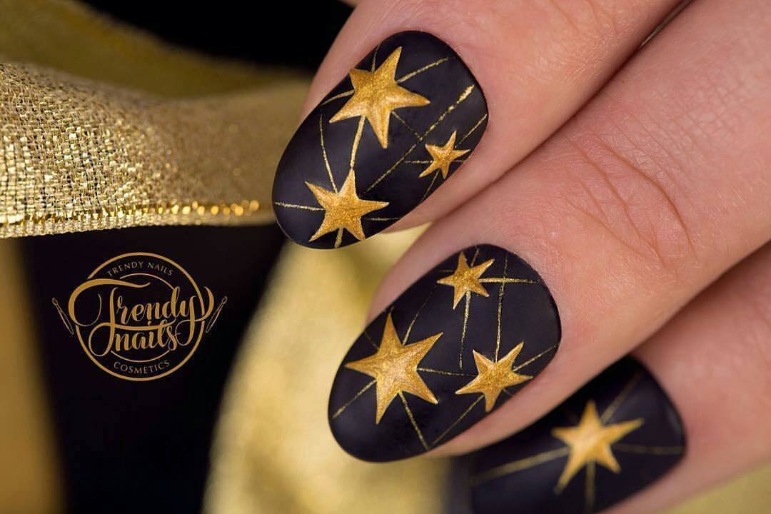 Tout revêtement sombre, qu'il soit noir, bleu, bordeaux ou de toute autre teinte, a l’air très riche, avec un dessus mat et de petites étincelles ou strass. Charme sera un dessin sombre dans un dégradé utilisant des paillettes, avec une bande de kamifubuki, ou une impression sous forme de peinture des ongles.