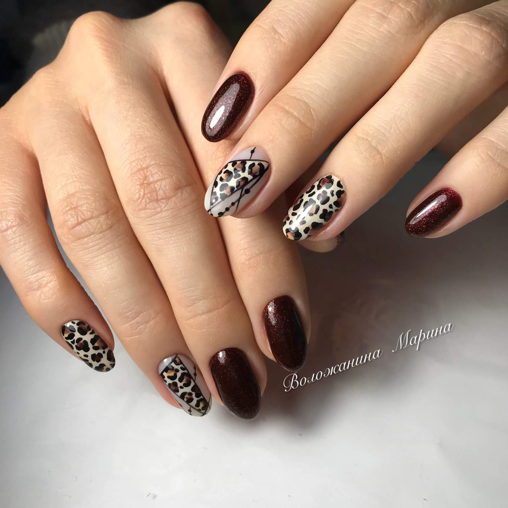 Cette saison, toutes les nuances de Bourgogne sont en demande. C'est un classique qui ne se démode jamais et qui convient à tout type de femme. Masters a proposé un grand nombre de techniques correspondant à cette palette de couleurs et révélant pleinement son potentiel. La couleur rouge, qui est prise comme base dans un duo avec du brun, est ravissante, à la fois sur les longues plaques à ongles pointues et sur une courte longueur. Il se marie parfaitement avec les notes dorées du design, il ressemble à un roi avec des pierres et est poudré.
