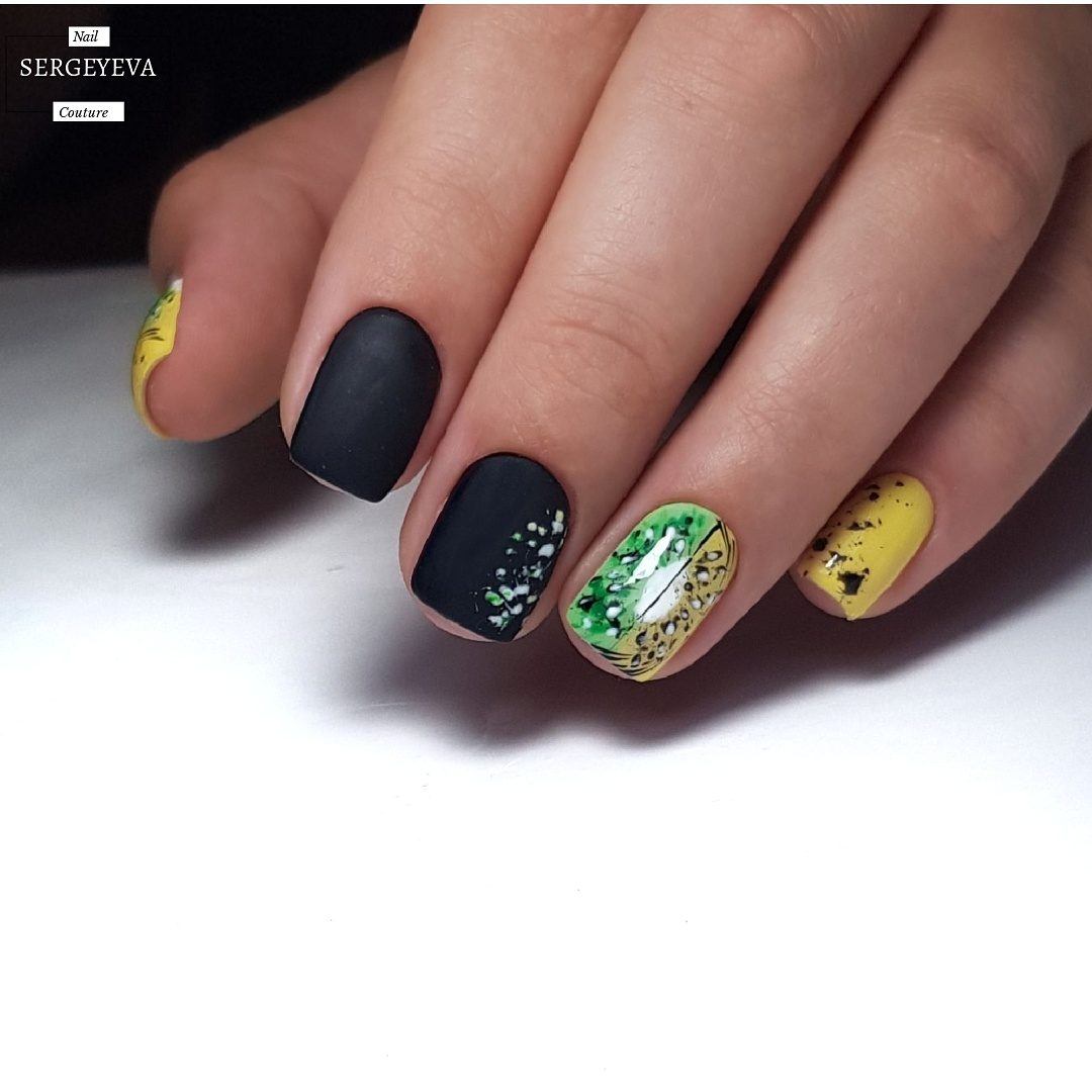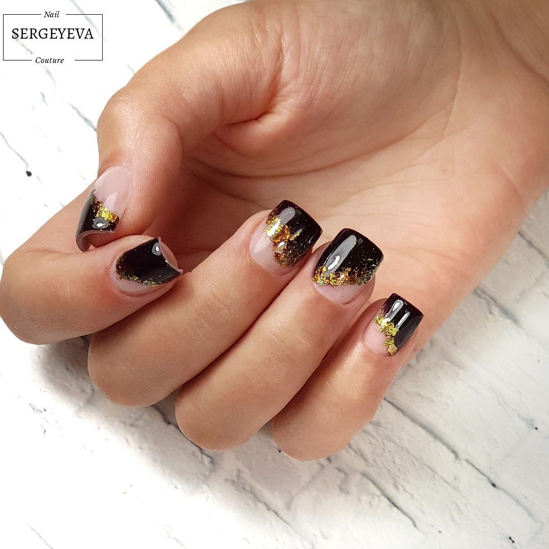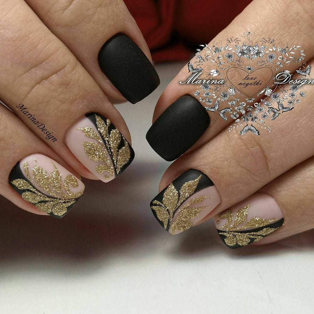Voulez-vous ajouter des nuances étincelantes aux notes sombres de votre manucure? Grâce au décor branché sous forme de feuille, cela ne sera pas difficile. Il est également très beau d'ombrager les ongles courts et longs avec une feuille mate ou colorée, créant ainsi des débordements très originaux sur un fond sombre.