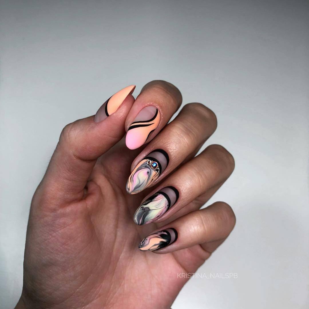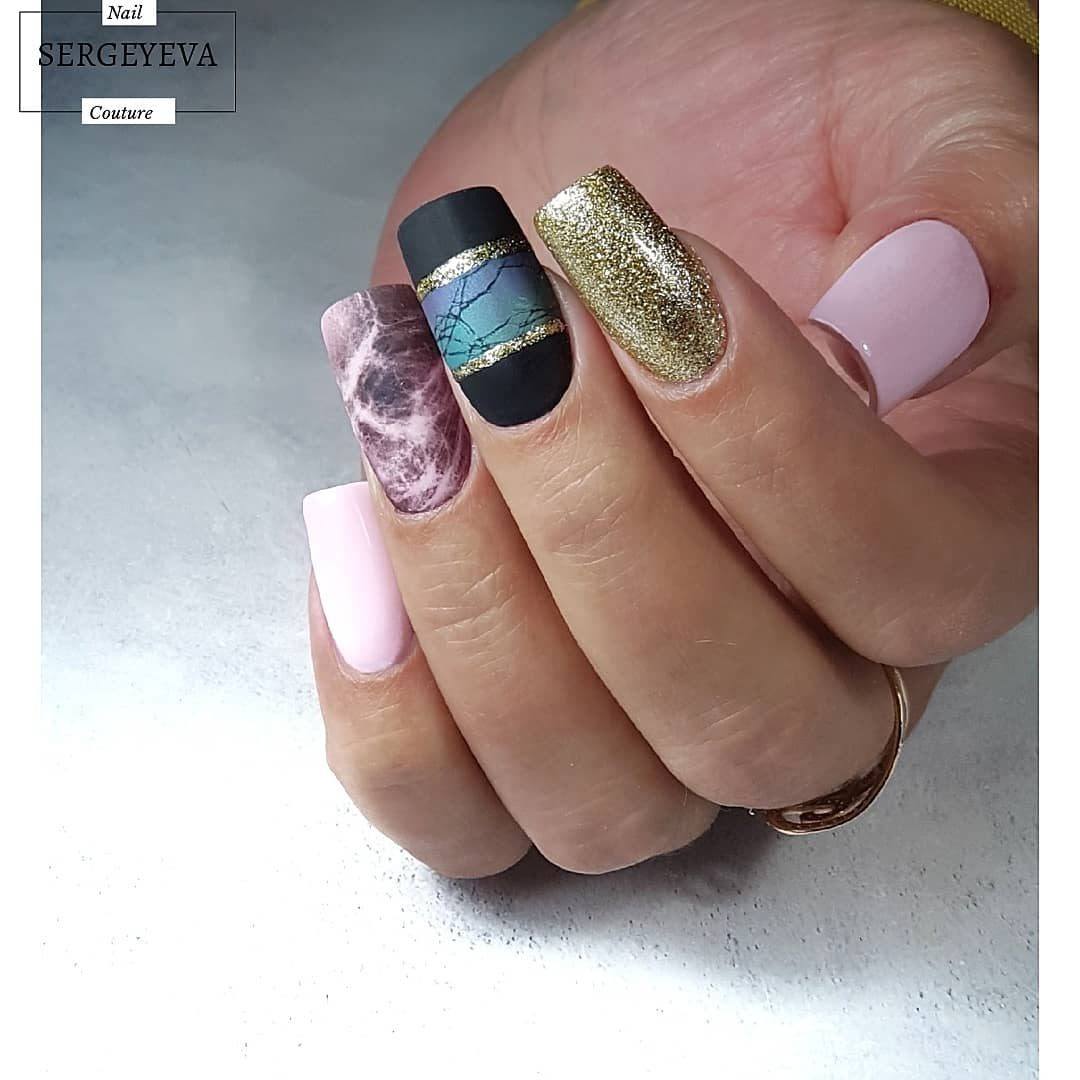 L'une des idées les plus populaires dans l'actualité du design des ongles cette saison est la technique de peinture à la manière des matériaux naturels - marbre, quartz, tourmaline et bien d'autres pierres. Le motif de "matériaux naturels" est très chic et mystérieux. Pour un effet marbré, ajoutez un peu d’étincelle, pour plus de naturel.