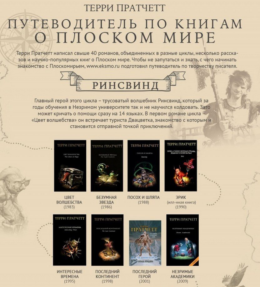 La série fantastique «Flat World» comprend 40 livres qui plairont certainement à ceux qui veulent oublier la routine quotidienne et profiter d’une philosophie légère et d’un humour subtil. L'action sur les pages de la fantaisie se déroule sur une planète plate où vivent différentes races (elfes, trolls, zombies et loups-garous). Tous se battent pour l'égalité sociale et leurs droits.