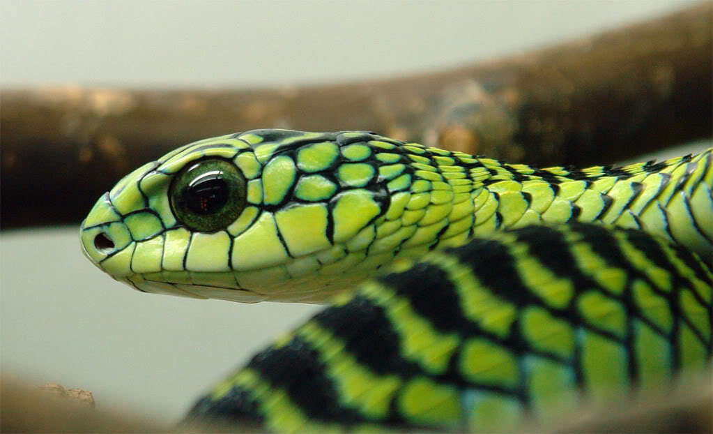 L'oeil humain des Boomslang est fascinant. La couleur vive des mâles et la teinte brune des femelles permettent de parfaitement camoufler des arbres sur lesquels ils grimpent parfaitement grâce à des écailles dures. Lorsque menacé, boomslang gonfle son cou. Une fois mordus, les poisons pénètrent dans le corps humain, provoquant des maux de tête douloureux et des vomissements. Si vous ne demandez pas d’aide à temps, les saignements internes seront incompatibles avec la vie.