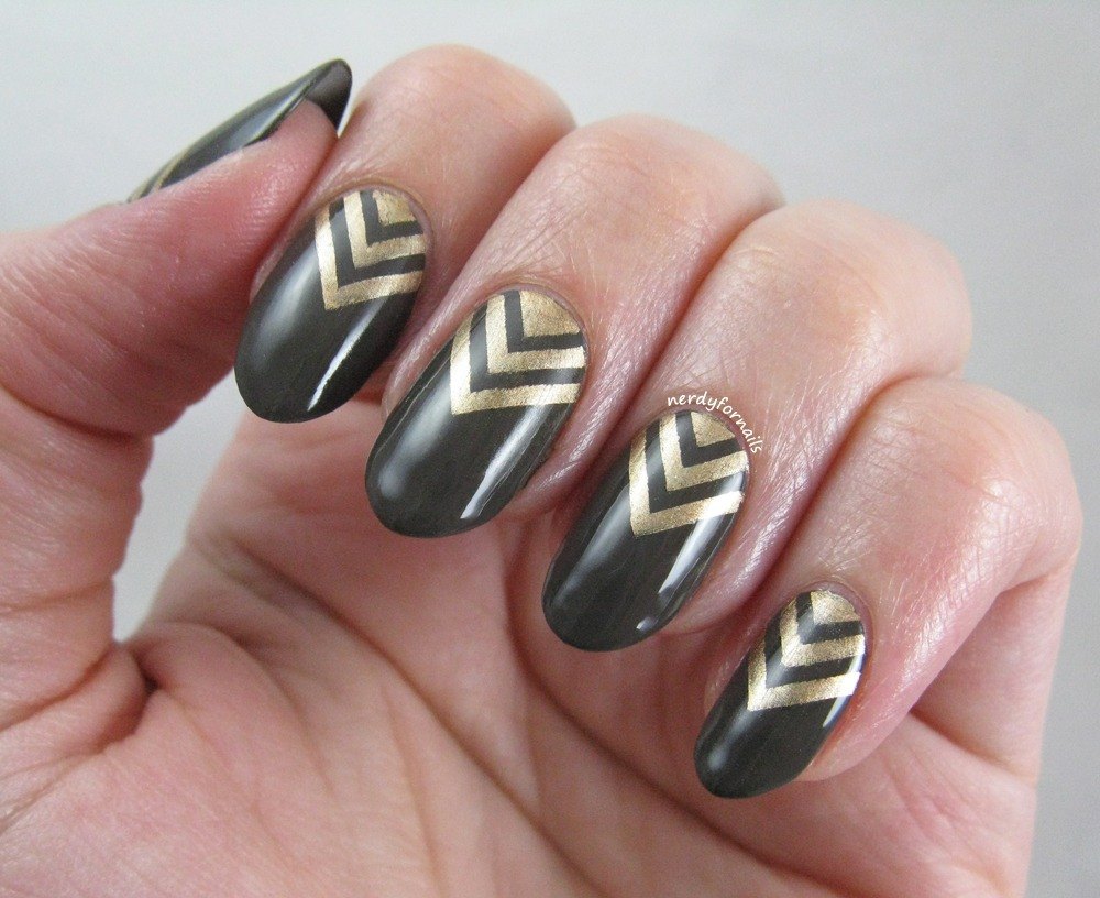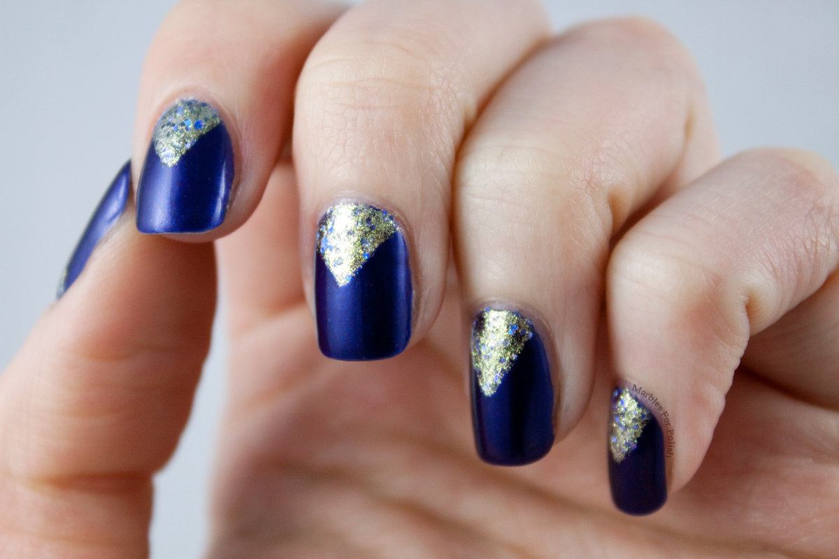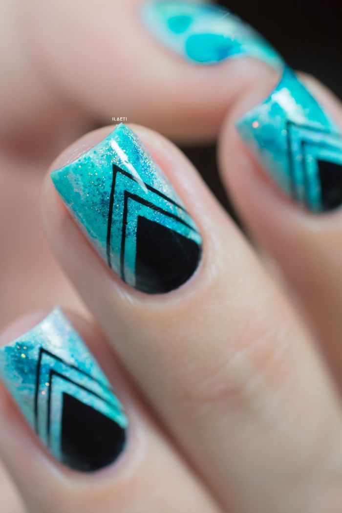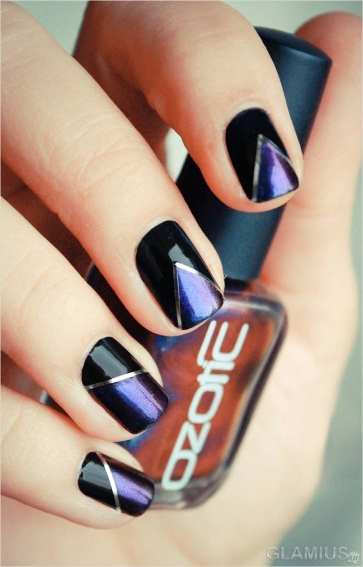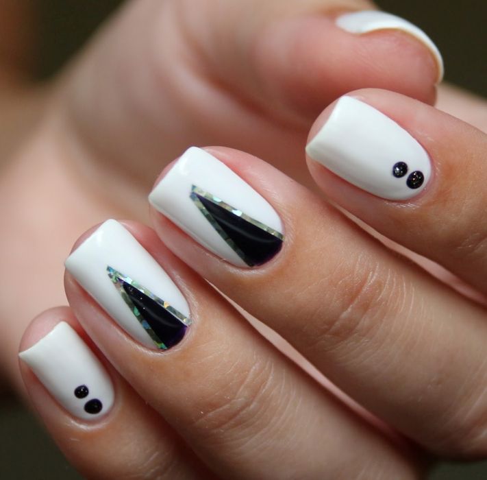 De plus en plus, une variété de décor de feuilles est utilisée pour concevoir une manucure triangulaire. Ce peut être un ruban adhésif, kamifubuki, "verre brisé" et bien plus encore. Chacune des options proposées crée un effet complètement différent. Par conséquent, avant de vous rendre chez le maître, nous vous recommandons d’examiner attentivement votre image et de décider du design.