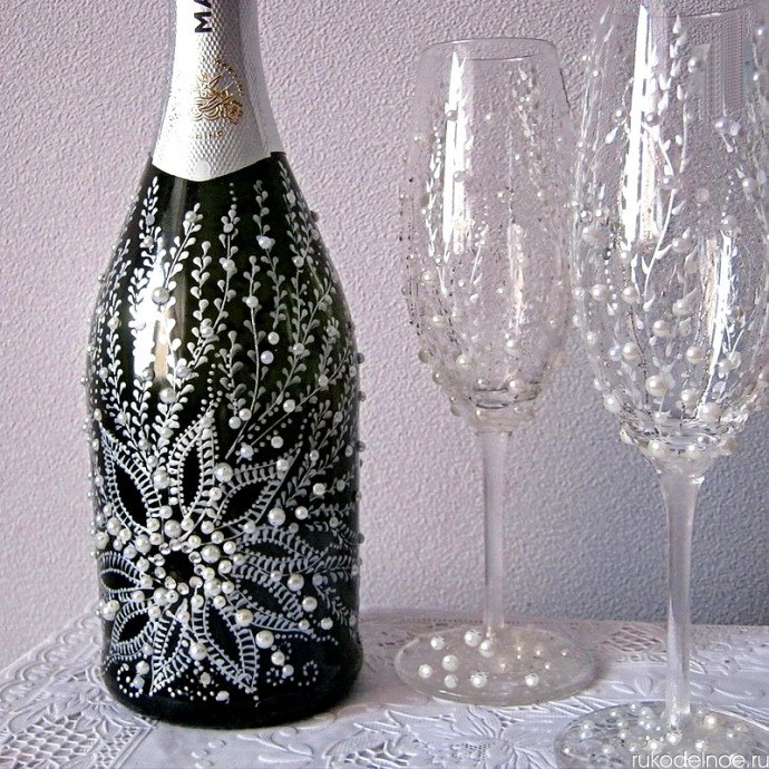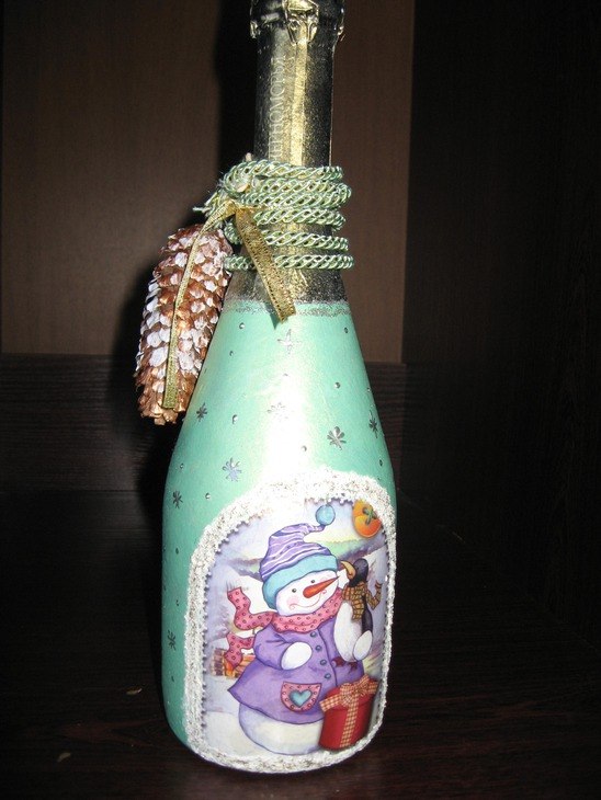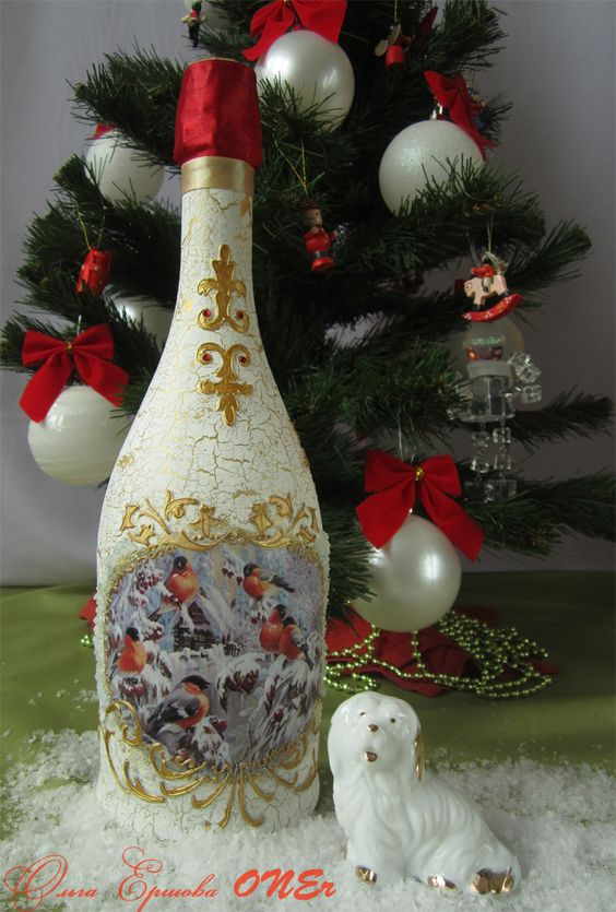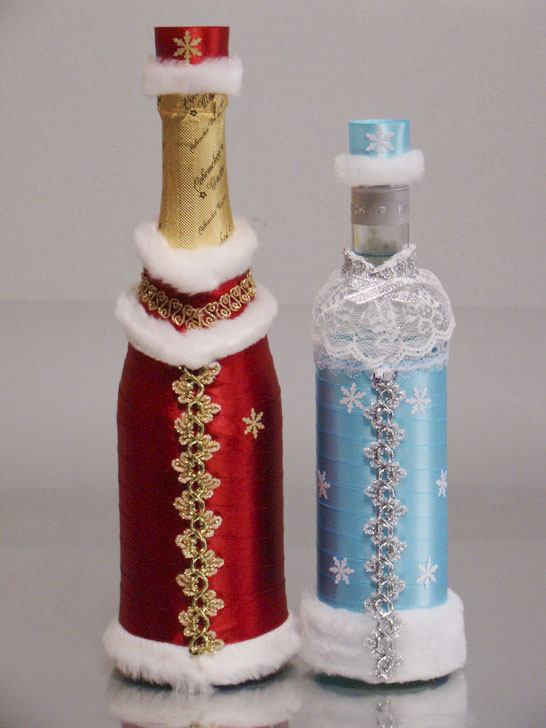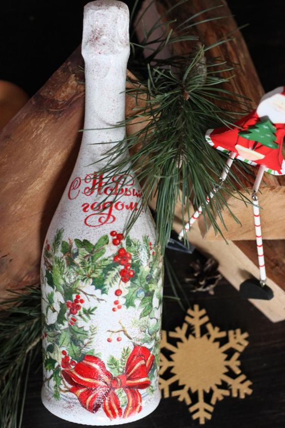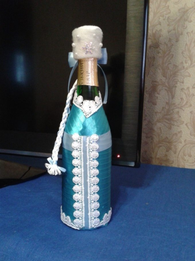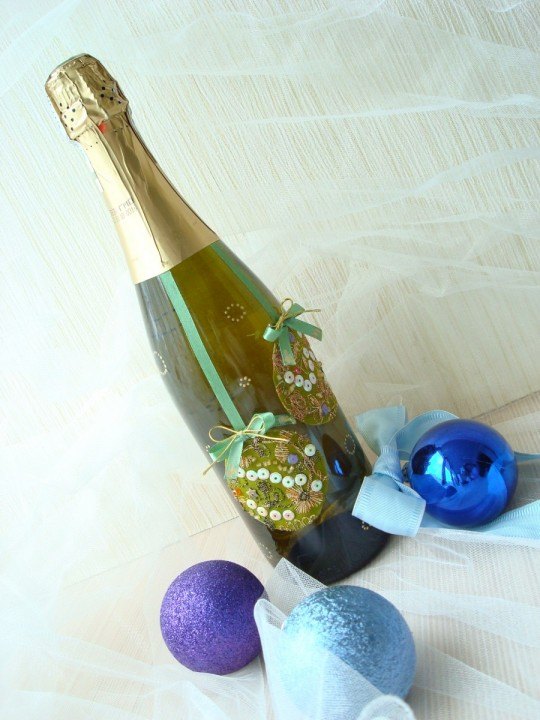 Il est intéressant de décorer une bouteille de champagne avec le pouvoir de chaque femme. Le processus prend un peu de temps, mais quel plaisir! Tous les efforts seront appréciés! Veillez à utiliser les symboles, les couleurs et les éléments du Nouvel An associés aux vacances pour la décoration du Nouvel An. Rubans de satin et de soie aux couleurs thématiques: rouge, vert, blanc, argent et or sont nobles et élégants sur une bouteille avec une boisson au champagne.