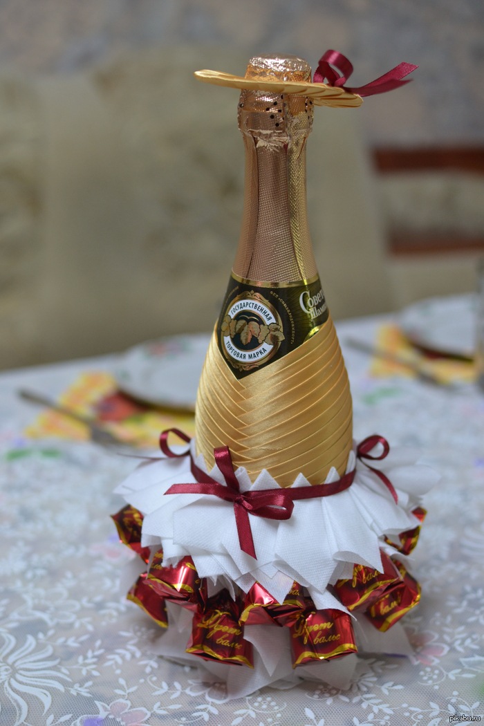 Bien sûr, pas un seul Nouvel An ne peut se passer de la célèbre boisson pétillante, et 2026 ne fait pas exception. Grâce à la décoration du champagne, vous pouvez améliorer l'ambiance du Nouvel An et dissiper l'atmosphère tendue entre collègues de travail. Le Nouvel An est une excellente occasion d’établir des contacts à l’aide d’une présentation présentée à des collègues sous la forme d’une bouteille de vin mousseux spécialement décorée, à boire immédiatement.