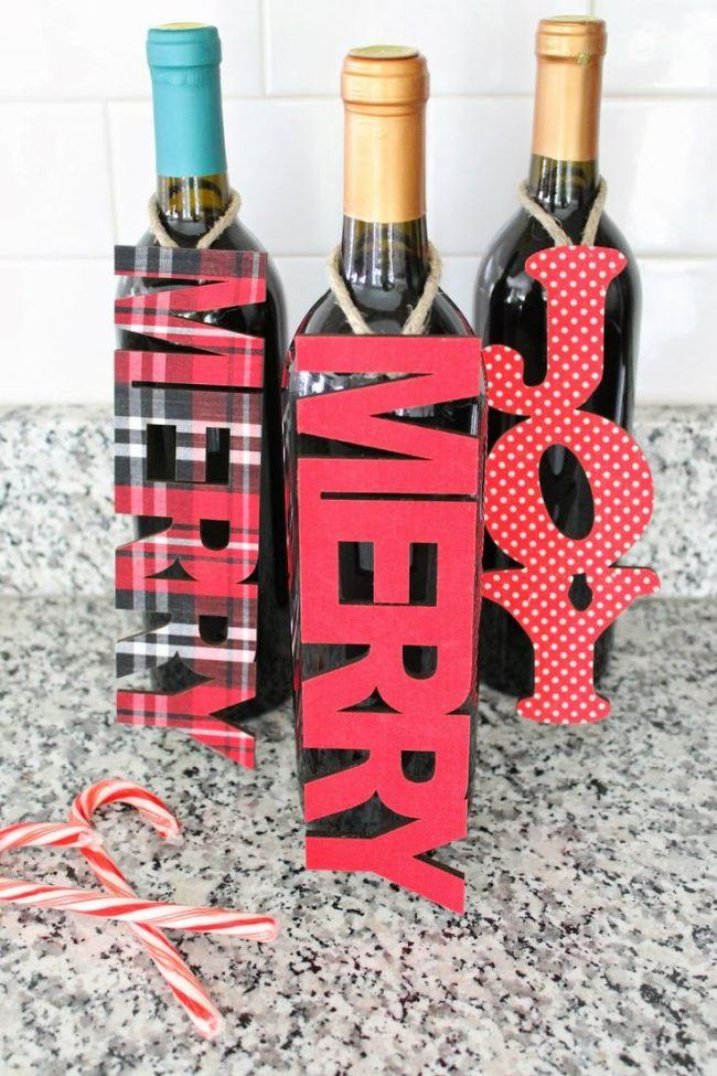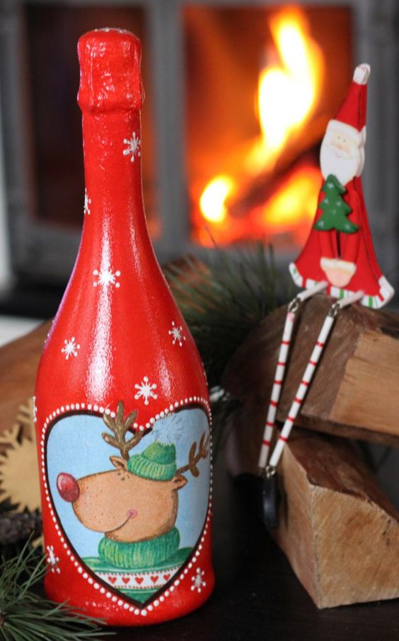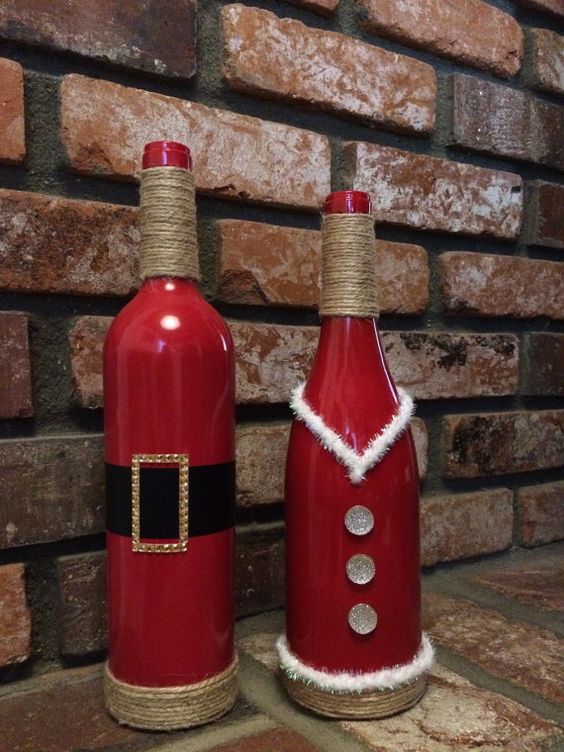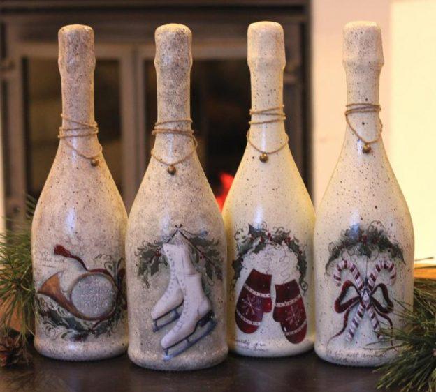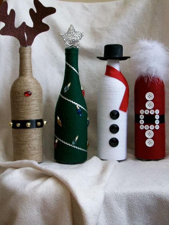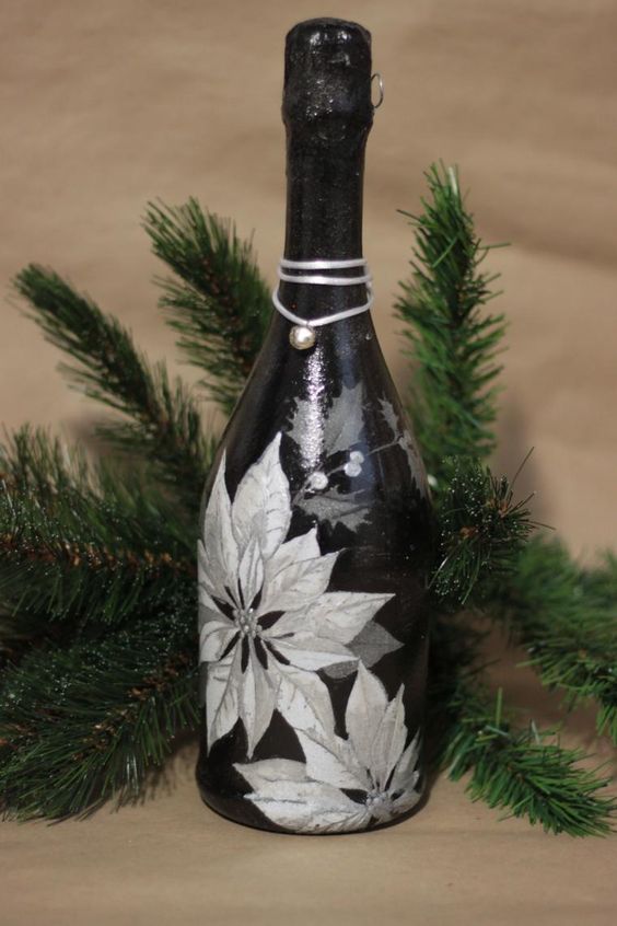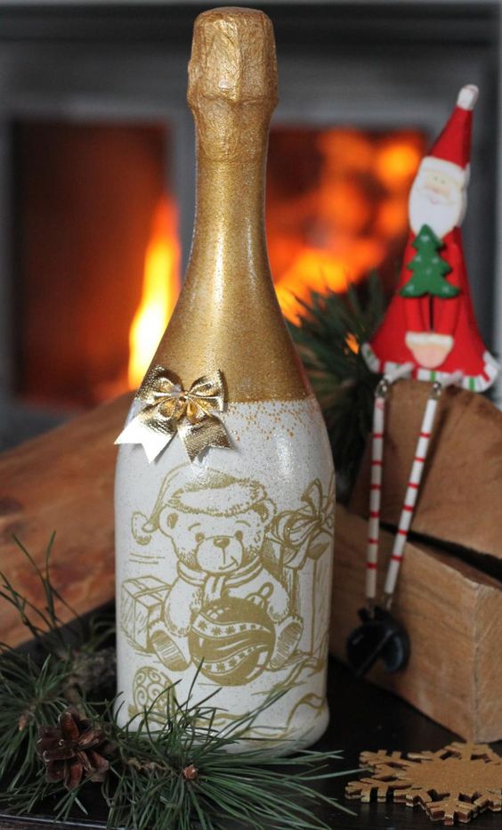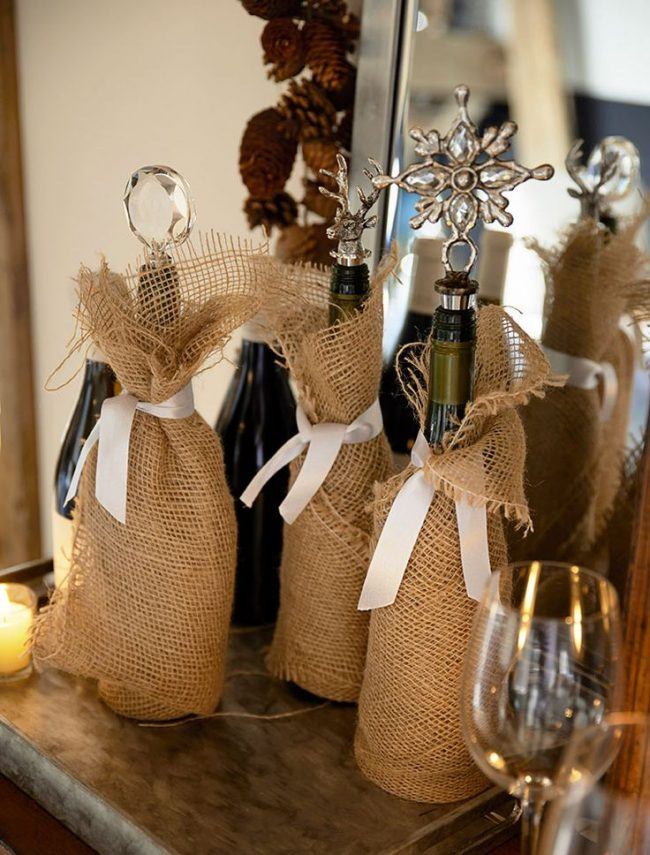 Si vous pensez qu’une bouteille habillée n’est pas une option très pratique, puisqu’il n’est pas très pratique de verser une boisson à faible teneur en alcool, décorez ensuite certaines parties, par exemple une étiquette ou un goulot. Découvrez de superbes compositions lumineuses du Nouvel An sous la forme d'une guirlande de Noël décorative posée sur une bouteille. Et si vous emballez également la bouteille dans du papier d'aluminium, après avoir bu de l'alcool, vous pouvez laisser une bouteille vide comme décoration du Nouvel An.