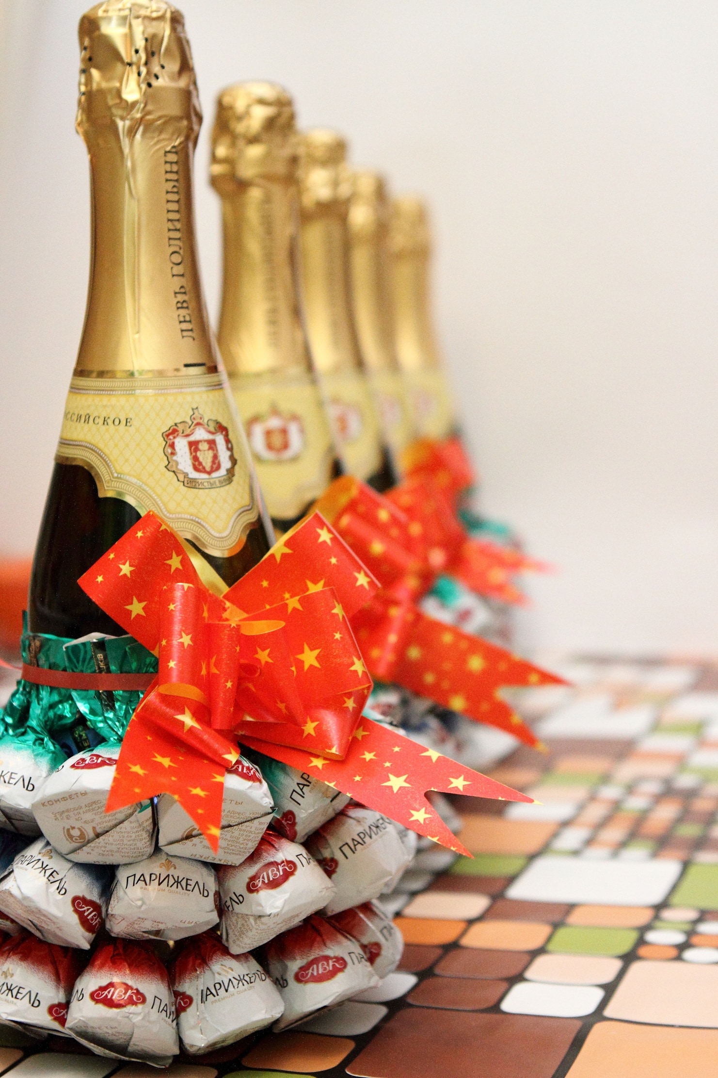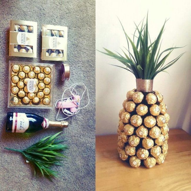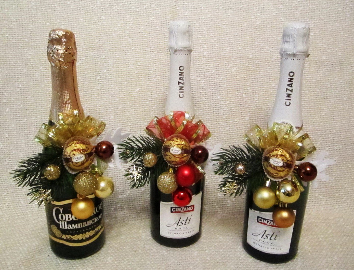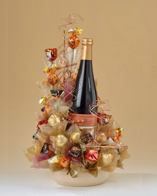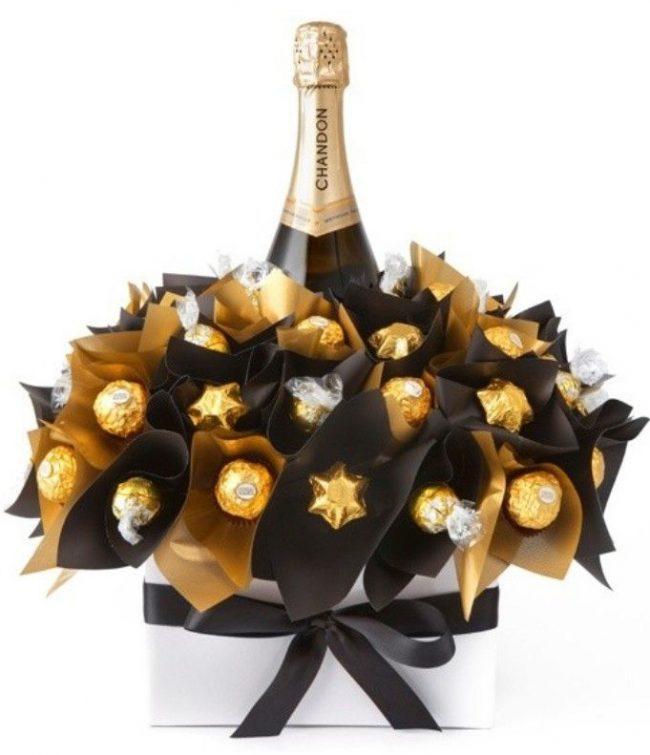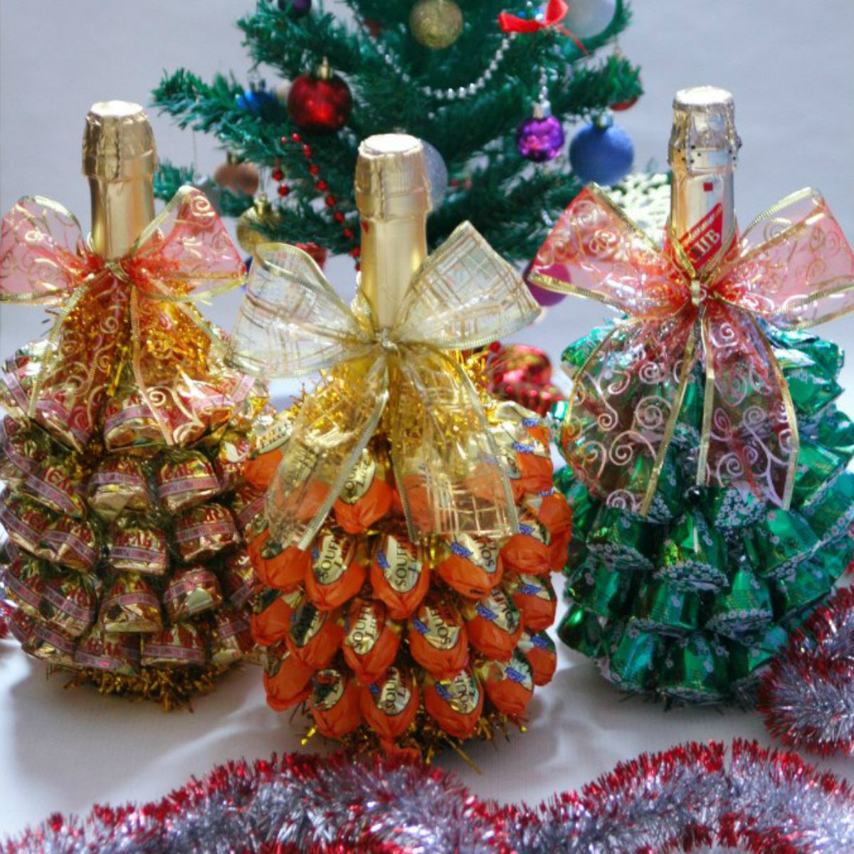 Pour beaucoup, les symboles de chaque année à venir sont l’arbre de Noël décoré de façon festive et un verre de champagne. Ne soyez pas trop paresseux pour organiser une bouteille pour la réunion 2026! La décoration originale de la bouteille avec les bonbons les plus ordinaires est très mignonne, simple et belle. Avec une telle décoration en chocolat ou en caramel, vous faites d'une pierre deux coups: la bouchée. Un cadeau exclusif est une bouteille de boisson à faible teneur en alcool du Nouvel An décorée de bonbons.