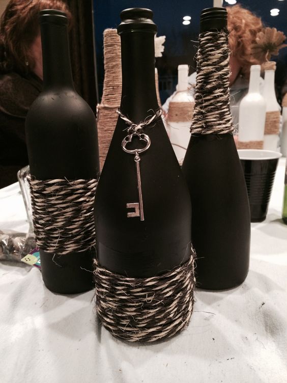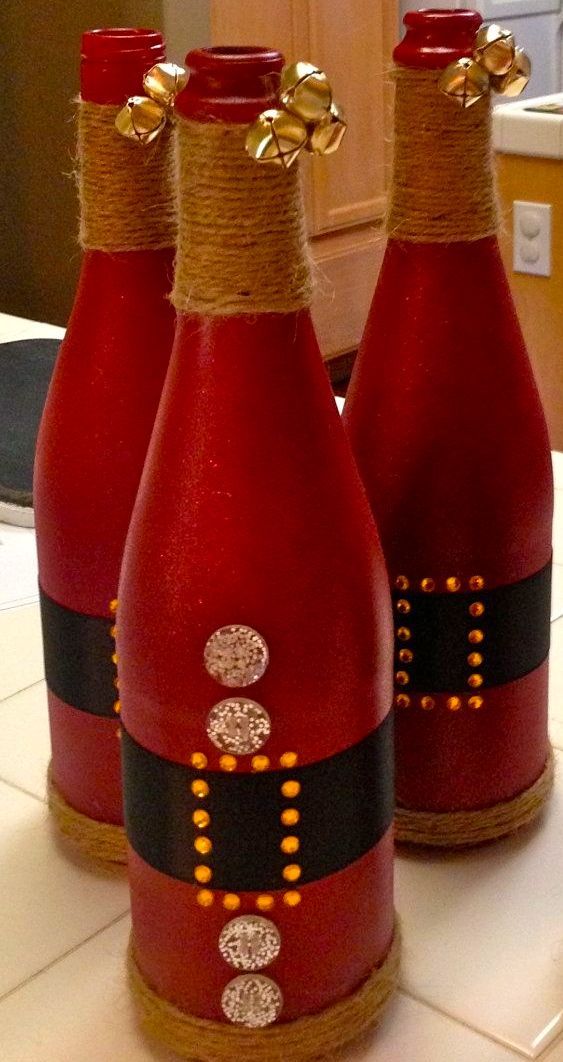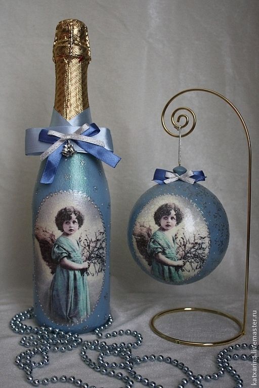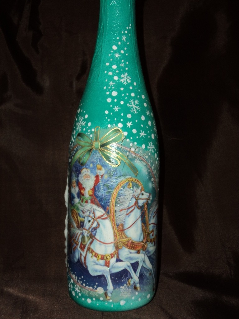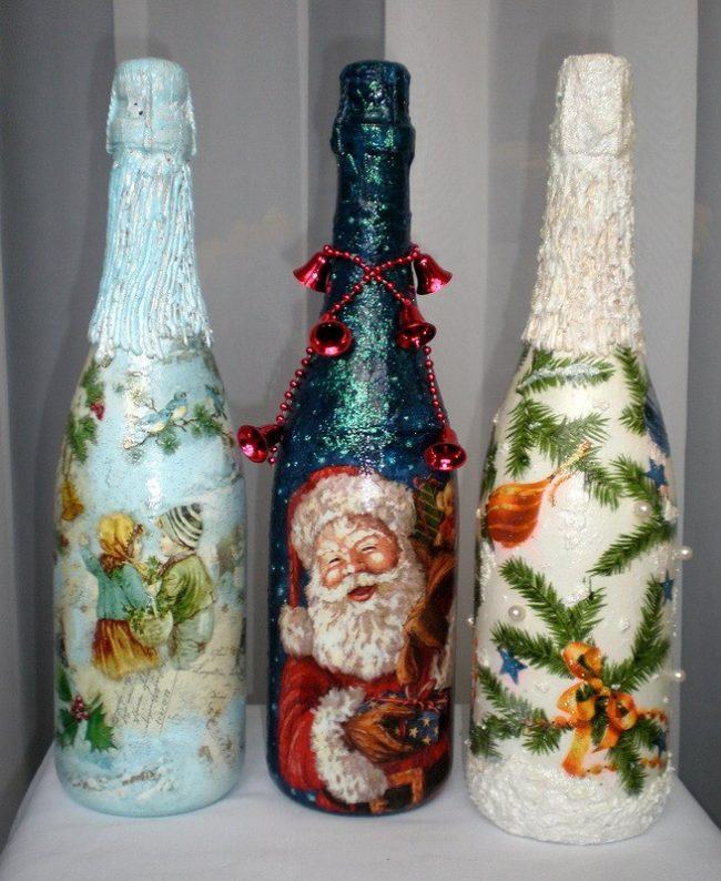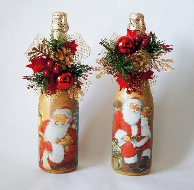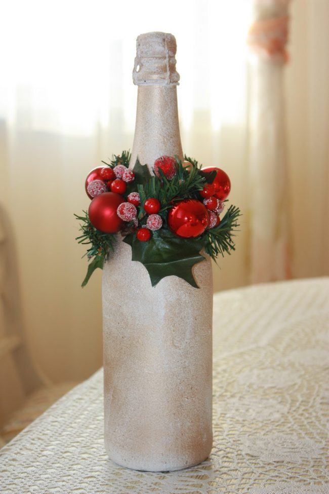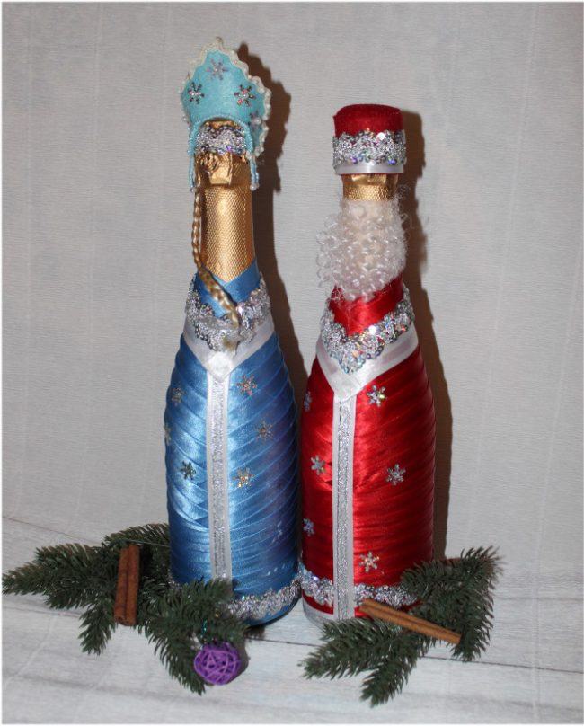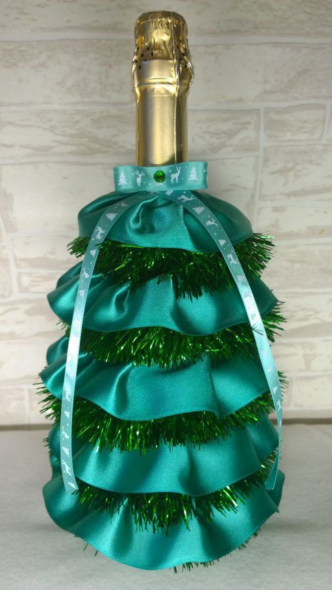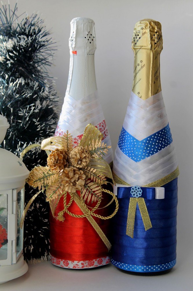 Quelles méthodes et quels matériaux ne sont pas utilisés lors de la création d'un chef-d'œuvre du Nouvel An à partir d'une bouteille de champagne. Les options les plus simples consistent à décorer la bouteille avec des guirlandes, des serpentins, des étincelles, de la ficelle, des rubans et bien plus encore. Pas besoin de réinventer la roue. Tout est pensé pour vous. Enveloppez simplement le matériau que vous voulez voir autour de la bouteille. Attachez-le et attachez un bel arc.Cette option de décoration est optimale et idéale pour une fête d'entreprise.