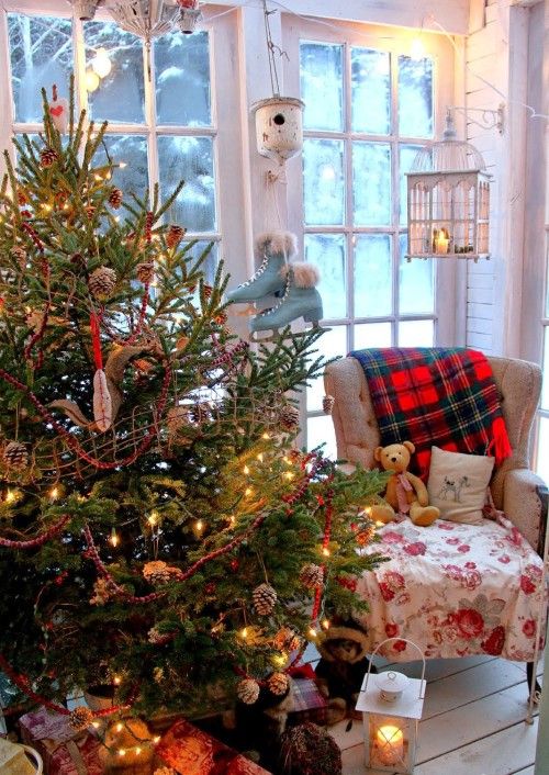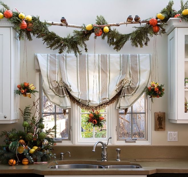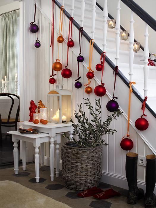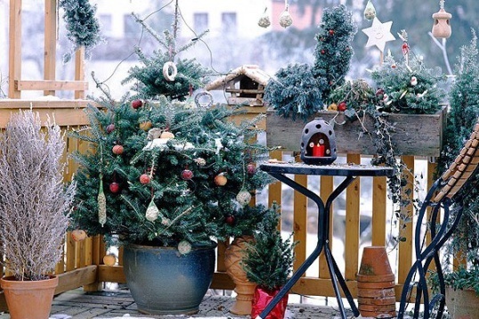 - jardinières suspendues avec éléments de décoration du Nouvel An: flocons de neige, étoiles, perles, cendres de montagne, branches d'épinette, bougies;