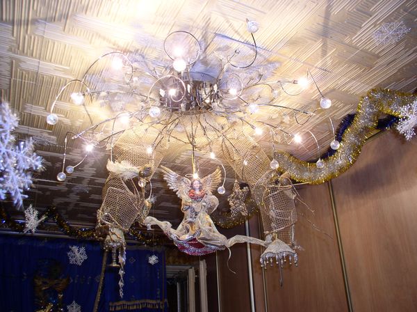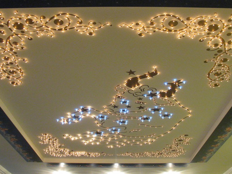 Pour créer une image spéciale du Nouvel An au plafond de la maison afin de faire face à la nouvelle année, vous pouvez utiliser des bandes LED spéciales. De plus, vous pouvez utiliser la pluie et des jouets suspendus sur une ligne de pêche. Et si vous préférez une décoration intérieure extraordinaire, des pochoirs à l’aide desquels la peinture acrylique est parfaitement appliquée sont conçus spécialement pour vous. N'ayez pas peur, il se lave facilement à l'aide d'un produit spécial, que vous devez entretenir à l'avance.