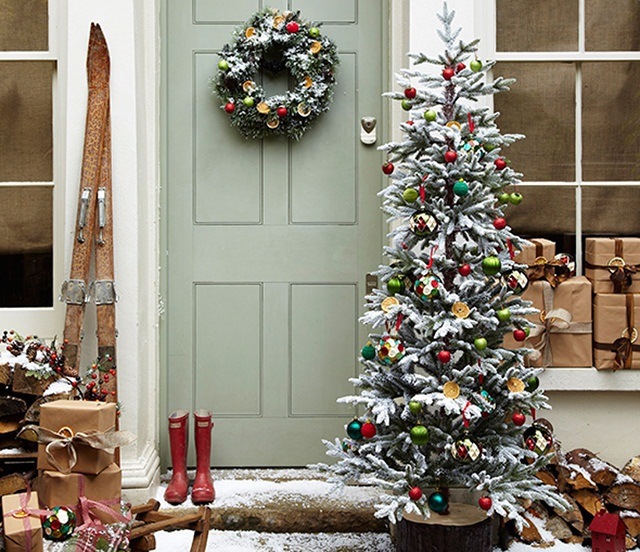 Les portes de la maison entre les pièces sont très souvent suspendues avec des guirlandes de sapins de Noël ou de petites guirlandes de Noël. D'un côté, cela suffit, mais de l'autre, c'est banal, car la première chose que les clients sont venus voir, ce sont les portes. Il est préférable de les concevoir dans le même style que la pièce de la maison. Les portes intérieures décorées avec un énorme flocon de neige moelleux et des rubans de satin semblent inhabituelles. Les portes extérieures de la maison sont toujours décorées selon le principe résiduel: elles moulent tout ce qui n’est pas dommage. Mais en 2026, prenez cette question plus au sérieux: décorez les portes d'entrée avec une composition d'arbre de Noël, félicitations avec des inscriptions.