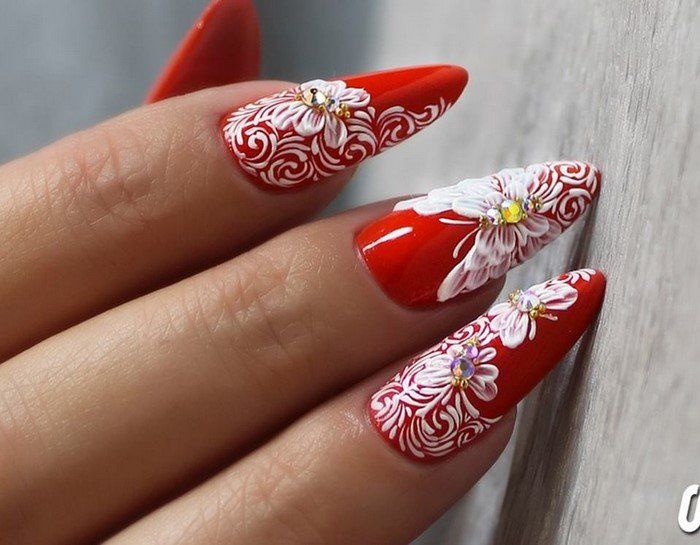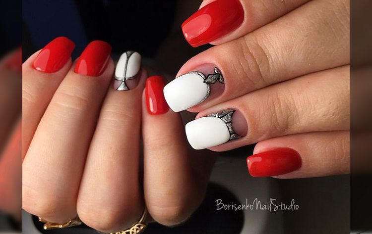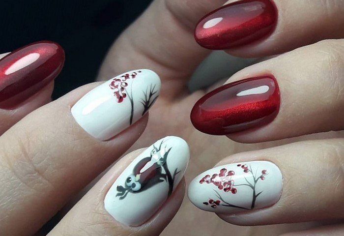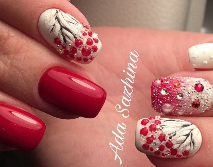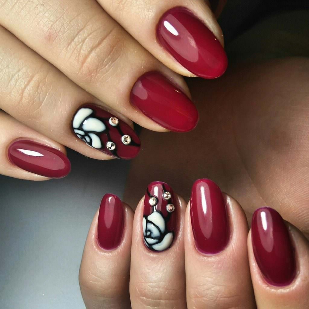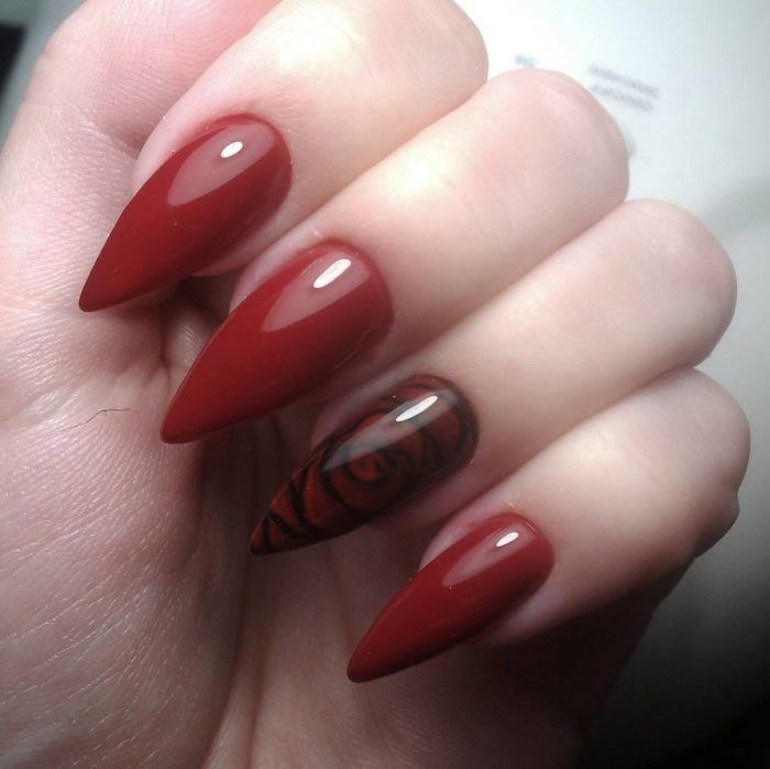 De beaux motifs complèteront toute manucure, cerise ne fait pas exception. Les motifs luxueux ont fière allure sur les ongles longs. Pour créer un beau dessin de manucure de cerise par un designer, une combinaison d'or, d'argent, de noir et de blanc est merveilleuse. Mais quel type de dessin mettre sur les ongles, dépend complètement de votre désir et de l'imagination du maître. Des motifs floraux, des ornements divers, des formes géométriques, un décor avec des strass, des pierres, des paillettes ou de la poudre auront fière allure. Les motifs peuvent être appliqués à tous les ongles et à un ou deux doigts.
