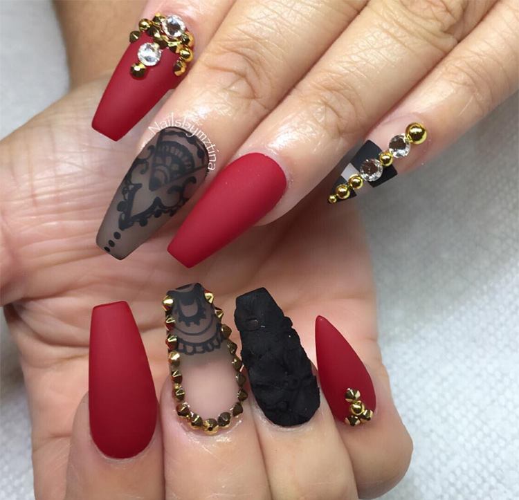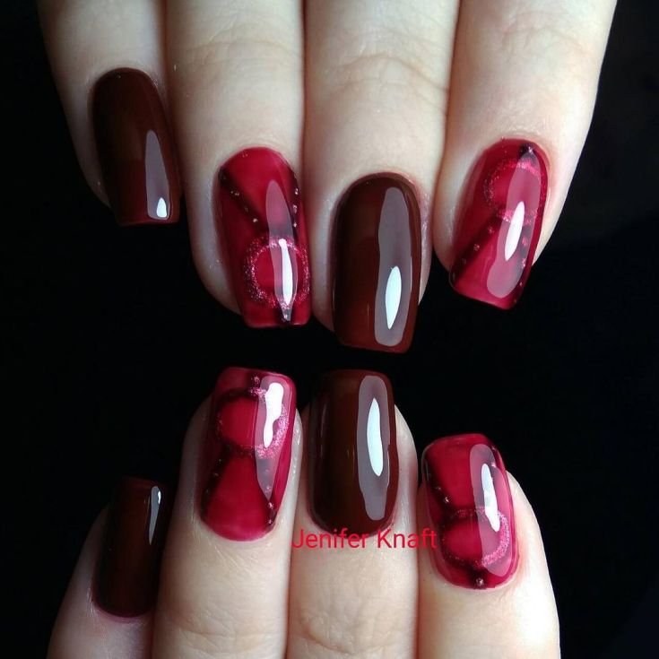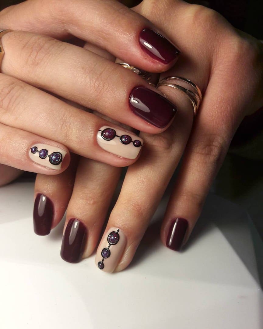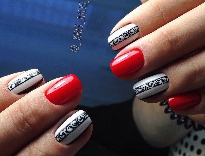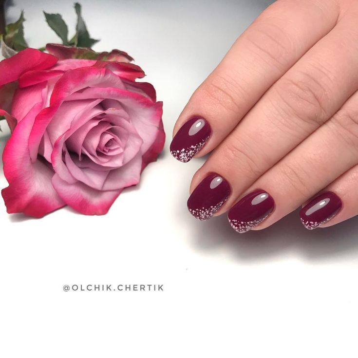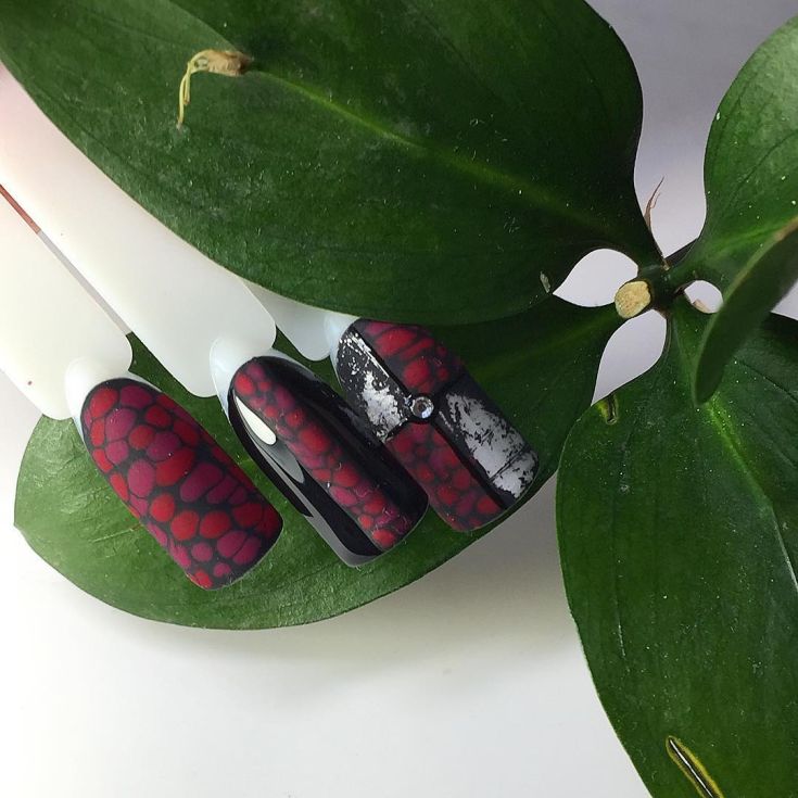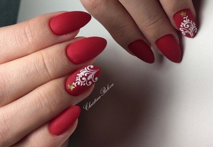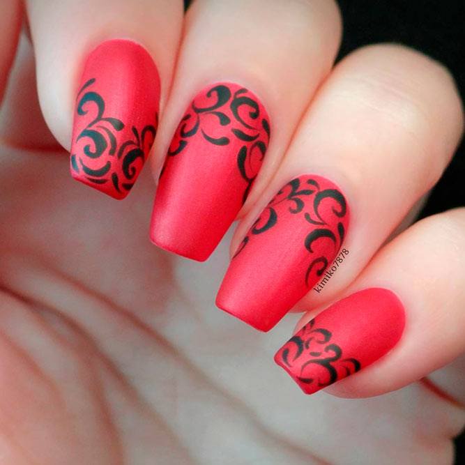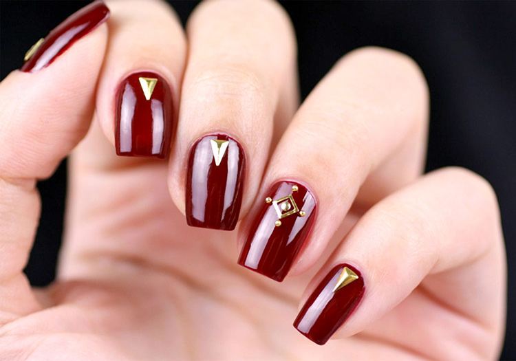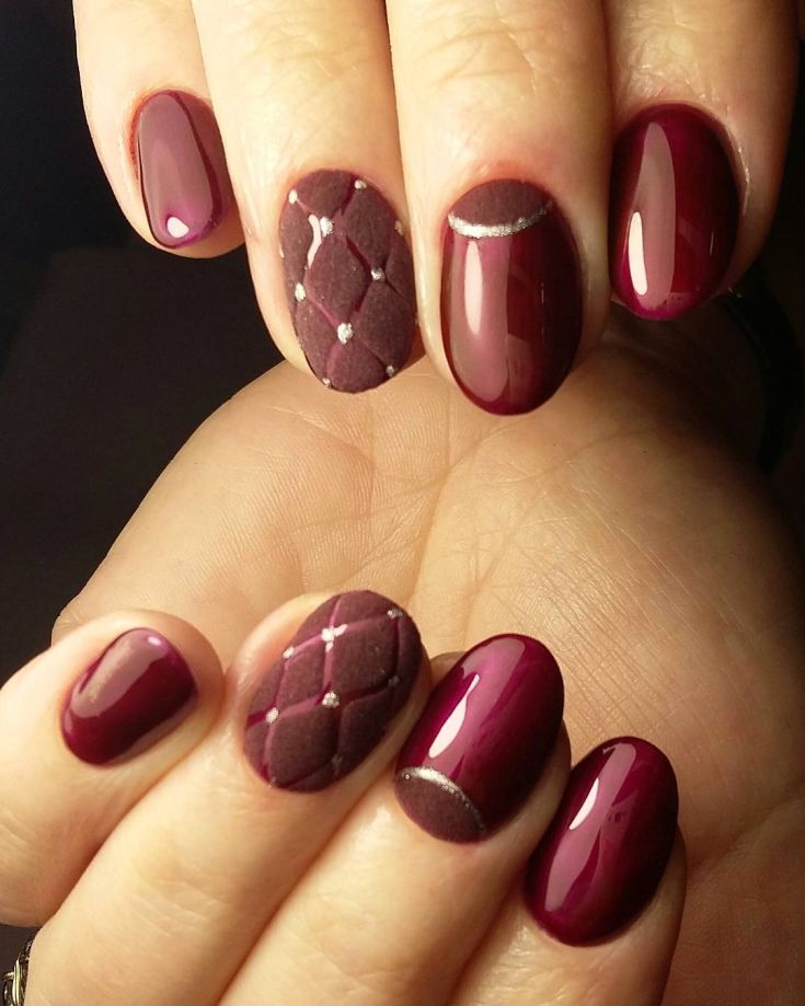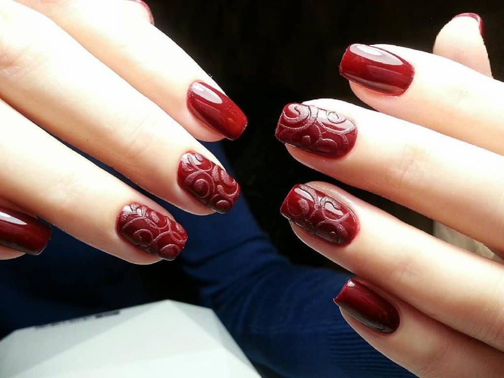 Dans le motif de brocart sur les ongles, on utilise généralement des détails dorés ou argentés, ce qui crée un motif attrayant. Le motif de brocart sur la manucure de cerise attire le regard, est magnifique et chic. En raison de la variété de motifs de brocart associés à la manucure de cerises, des compositions luxueuses et riches sont obtenues. Surtout si vous utilisez de l'or pour la peinture et du sable de velours pour créer une telle manucure. Après avoir choisi une nuance de cerise comme base de manucure, appliquez un motif de brocart doré et une manucure de luxe est prête. La manucure de brocart ressemble un peu à la culture des pays de l’Est, de la Perse, de la Chine et de l’Inde.