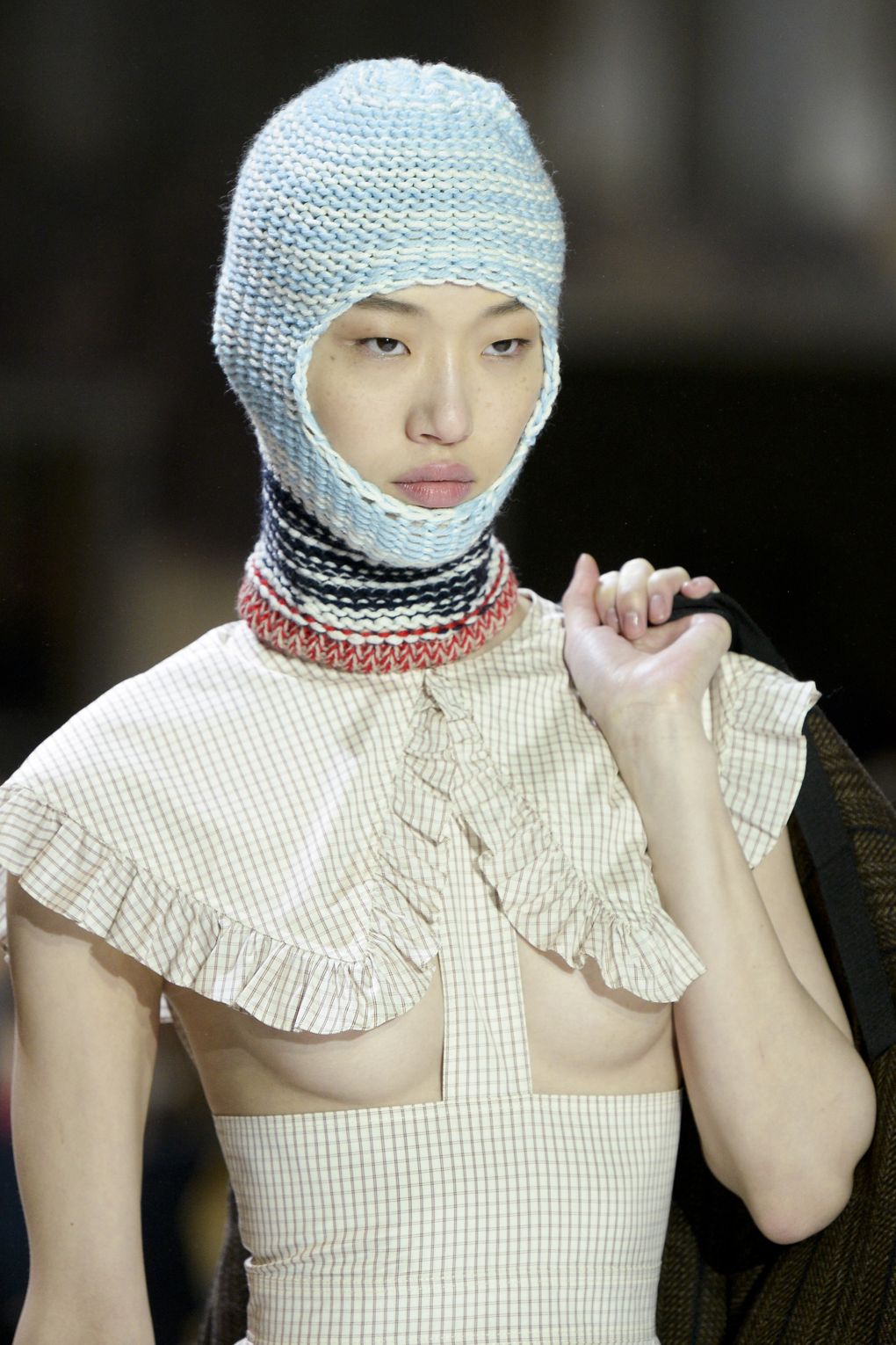 Le capot est utilisé de manière plutôt extravagante et audacieuse. Il est à noter que toutes les filles ne peuvent pas les porter correctement. Mais dans le cas d'une combinaison complète de capot avec un kit commun, il semble incomparable. Les designers ont décidé de combiner une robe de soirée avec une capuche en tricot, ce qui est une solution très inhabituelle. Il est intéressant pour les femmes que la forme de la casquette ressemble à une cagoule, qui peut être combinée à une doudoune en forme de baril.