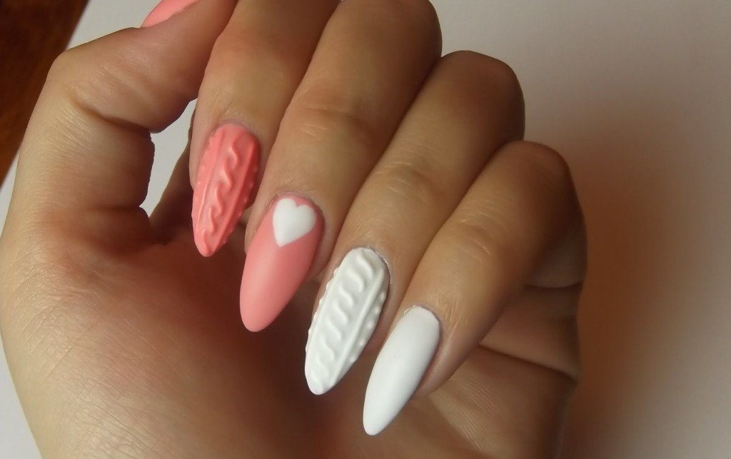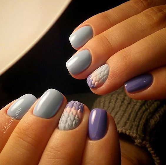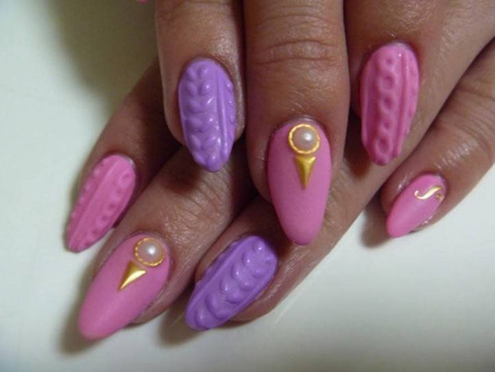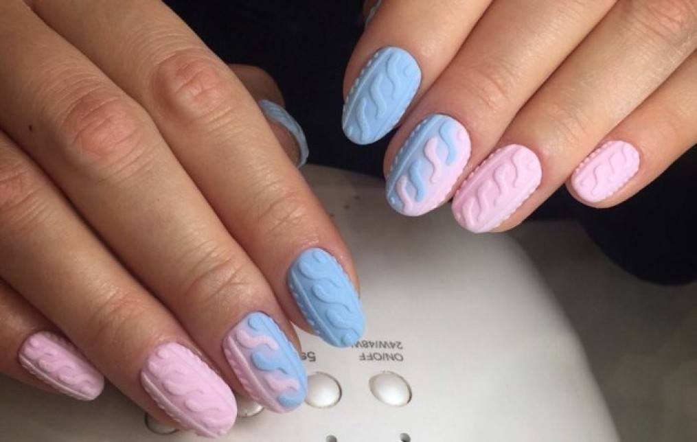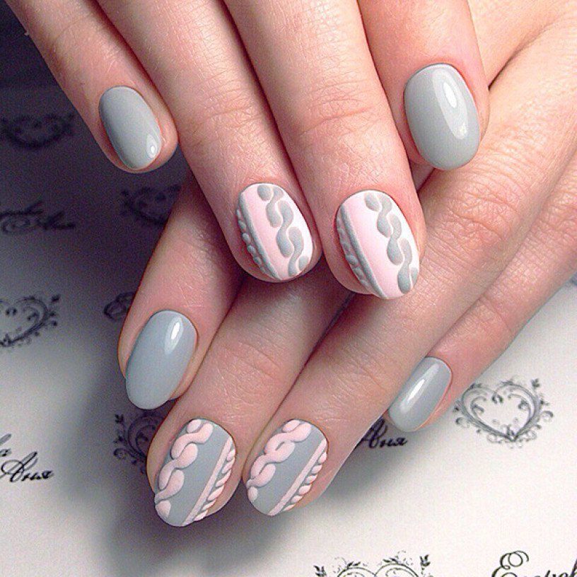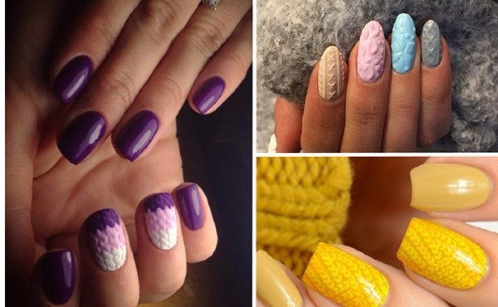 Un design tricoté à la mode peut être créé de différentes manières. Il peut être volumineux, ainsi que des motifs brillants. Les Maîtres conseillent fortement d’effectuer un motif similaire avec de la poudre acrylique. Cela donne un effet et une texture spéciaux. Il existe un très grand nombre d’options pour dessiner un motif de nattes, de points, de traits, etc. Vous avez juste besoin de saisir votre inspiration et de vous fier complètement à votre imagination.