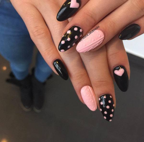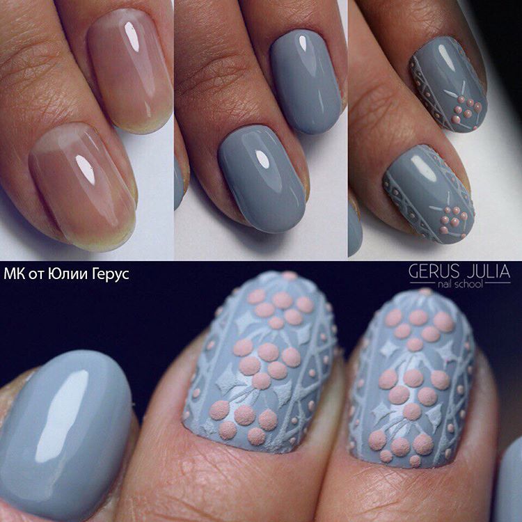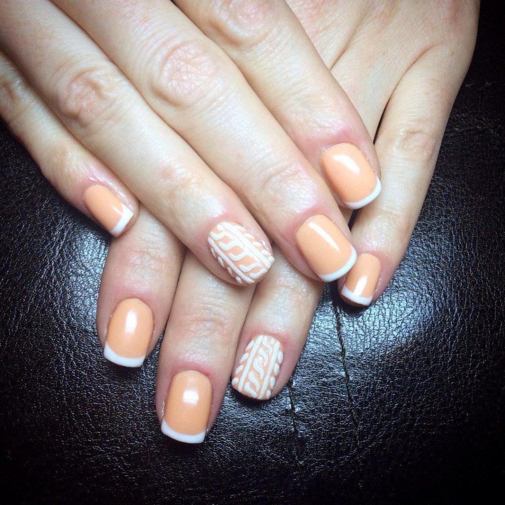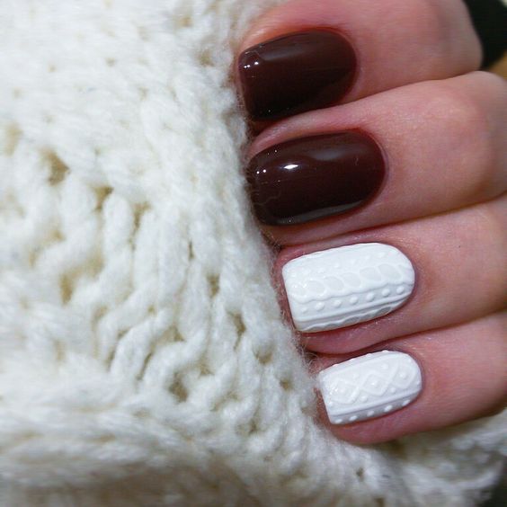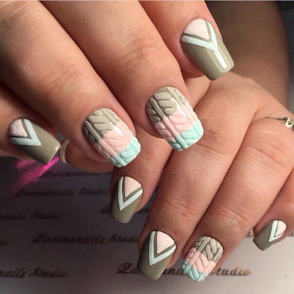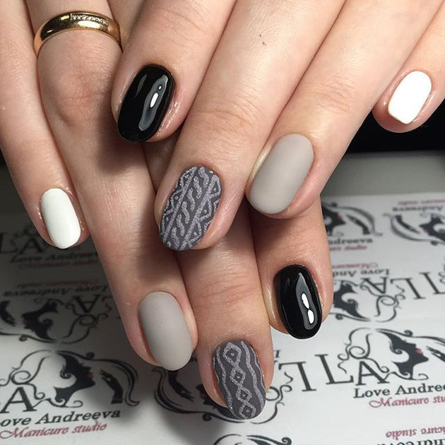 Un design tricoté à la mode peut être créé de différentes manières. Il peut être volumineux, ainsi que des motifs brillants. Les Maîtres conseillent fortement d’effectuer un motif similaire avec de la poudre acrylique. Cela donne un effet et une texture spéciaux. Il existe un très grand nombre d’options pour dessiner un motif de nattes, de points, de traits, etc. Vous avez juste besoin de saisir votre inspiration et de vous fier complètement à votre imagination.
