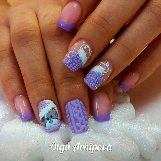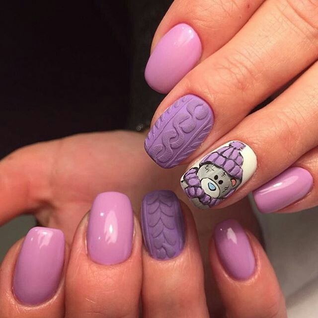 Ours en peluche - un type de motif qui est très commun en combinaison avec un style tricoté. Des artisans plus expérimentés décrivent des ours avec du vernis ou des peintures acryliques sans trop d'effort. Mais les débutants trouveront cette tâche impossible, car ce dessin est très petit et difficile à réaliser. Il est donc préférable d’utiliser des autocollants. Aujourd'hui, dans de nombreux magasins, vous pouvez acheter différentes diapositives adhésives avec des ours et tous les autres personnages de dessins animés qui auront fière allure en combinaison avec un motif tricoté. Cette option de manucure a l’air très séduisante et mignonne.