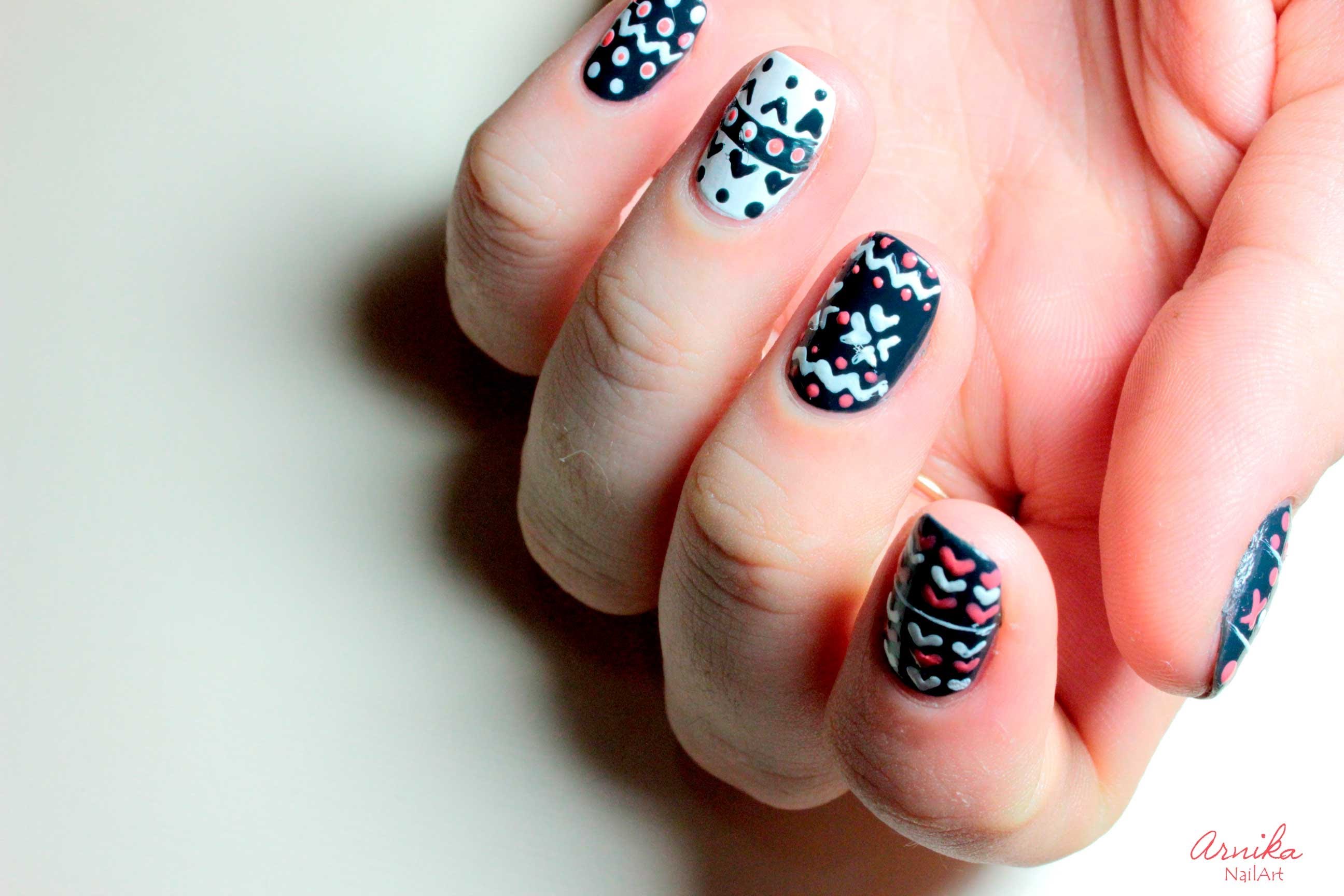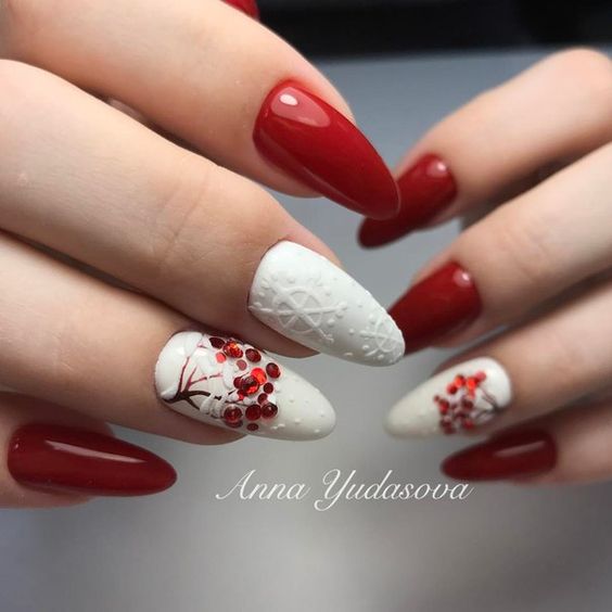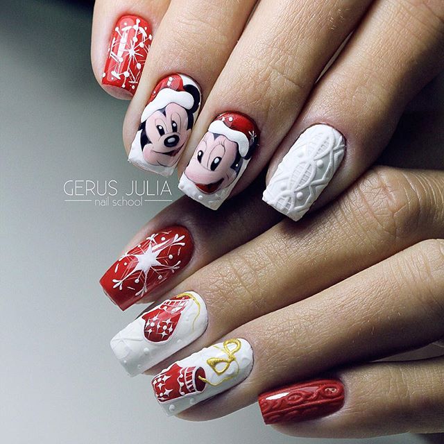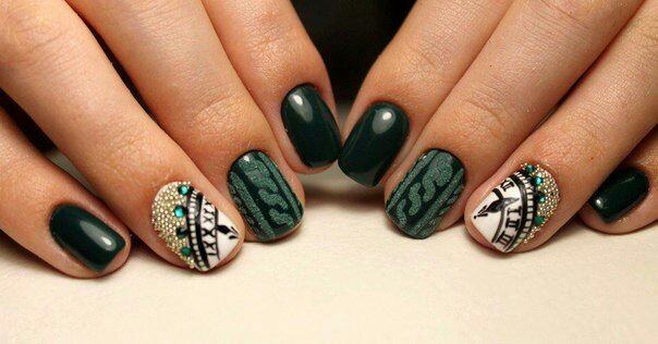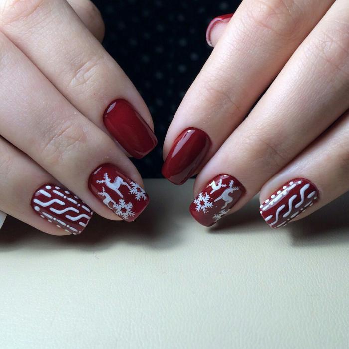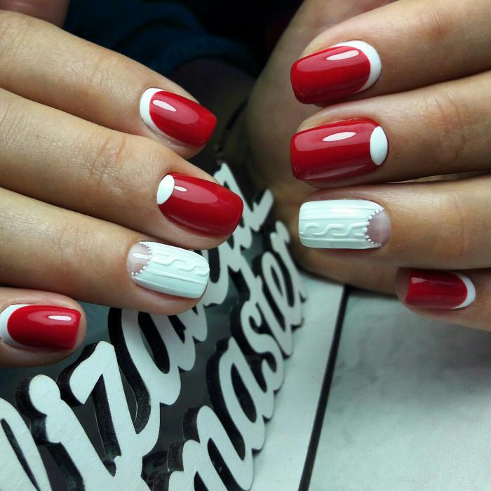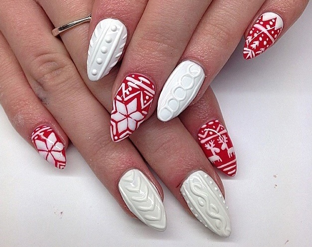 Le design tricoté est très bien combiné avec des flocons de neige, des ornements et des cerfs du style scandinave.Une telle manucure implique exclusivement des couleurs gris-brun ou rouge-blanc. Pour tracer un flocon de neige scandinave aux contours plus nets et plus précis, il est préférable d'effectuer un marquage de point préliminaire. Ensuite seulement, connectez-les avec des lignes fines et soignées et peignez complètement avec la couleur principale. L'alternance d'un motif tricoté avec un ornement scandinave, complété par des points et d'autres motifs géométriques, a fière allure.