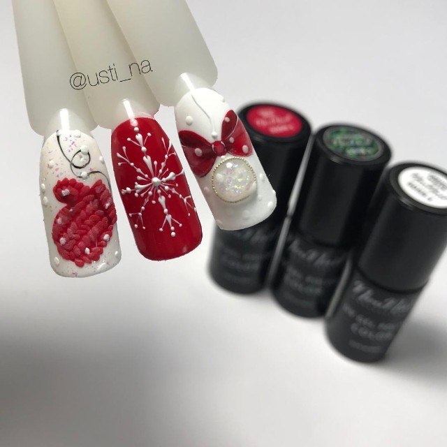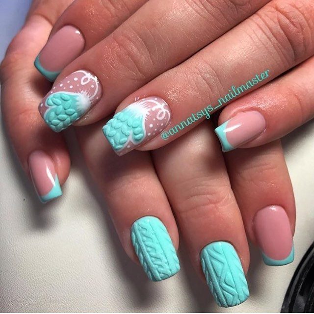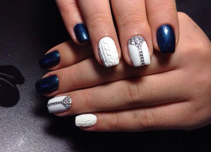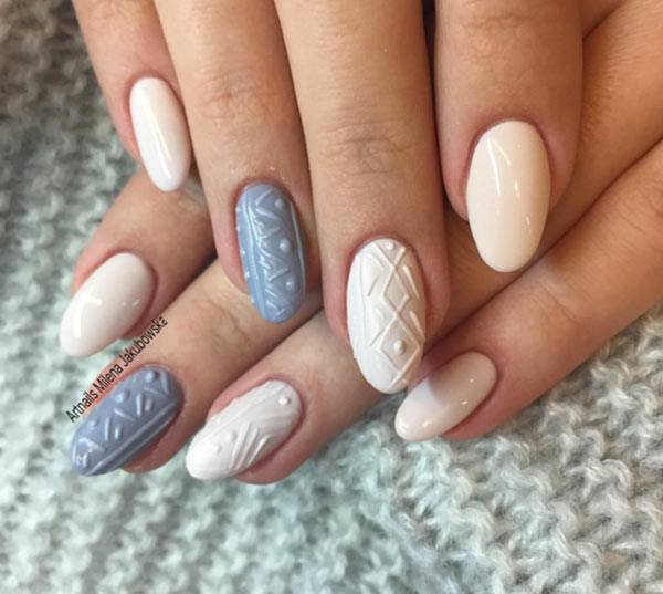 Le design du «pull» est considéré sans équivoque comme un hiver, raison pour laquelle il a l'air sophistiqué et spectaculaire avec ses flocons de neige volumineux parsemés d'étincelles ou de poudre. Pour la vie de tous les jours, une manucure française transparente avec des éléments de flocons de neige blancs est une excellente option. L’annuaire se distingue par un volumineux motif tricoté. Un tel nail art est le plus souvent réalisé dans des couleurs pastel ou bleues et blanches.
