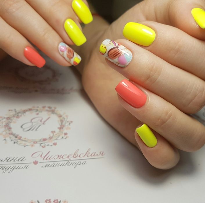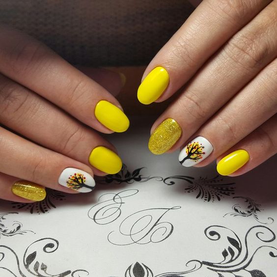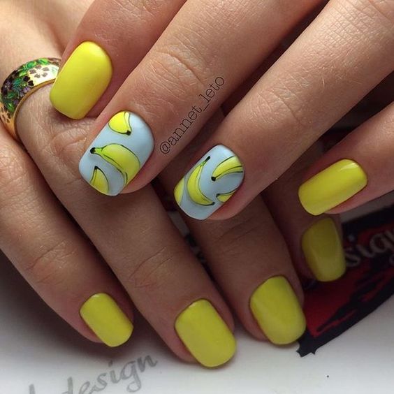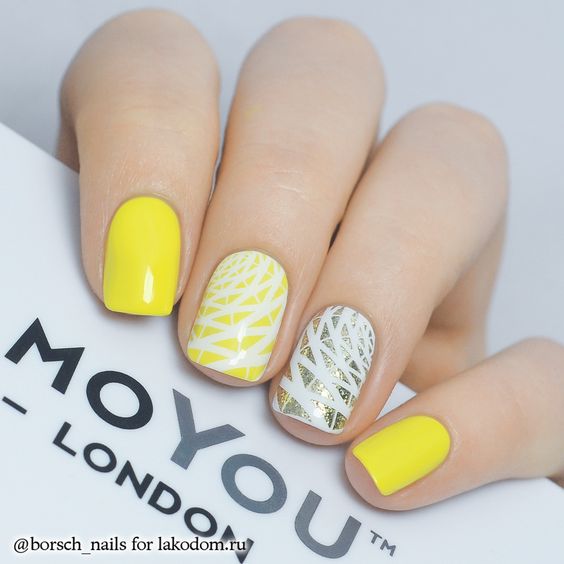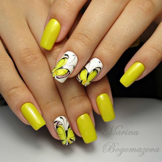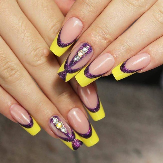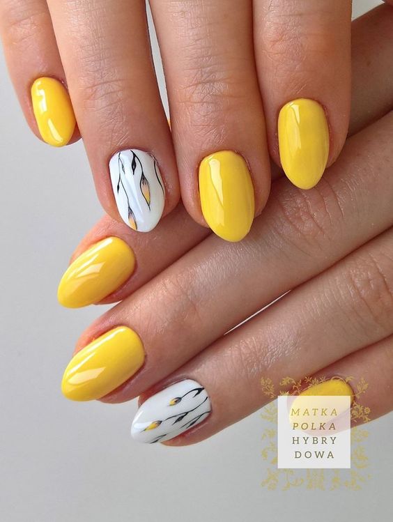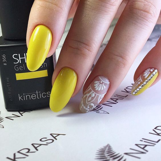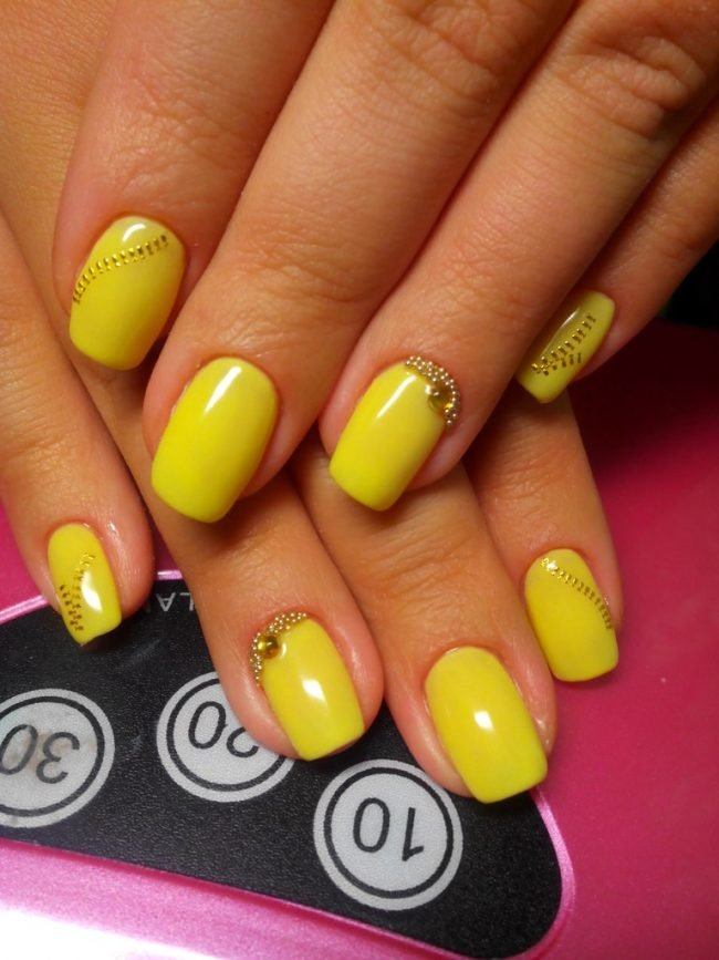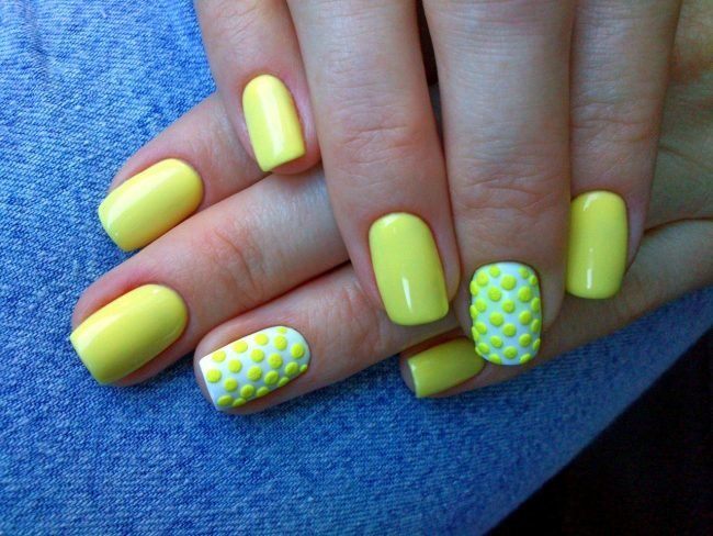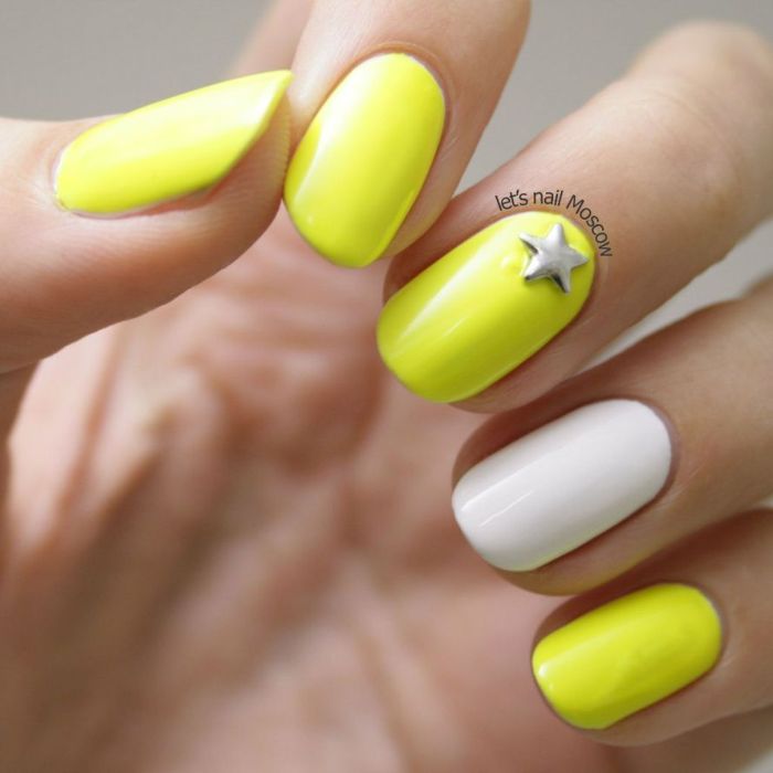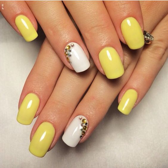 La combinaison de jaune et de blanc est toujours particulièrement belle et ensoleillée. Par conséquent, en été - c'est l'une des options les plus populaires pour la manucure. Mais néanmoins, cela ne signifie pas que vous ne devriez pas utiliser de décor supplémentaire. Les petits strass sont la meilleure décoration. Cependant, une excellente solution serait un dessin sur un ou deux clous.