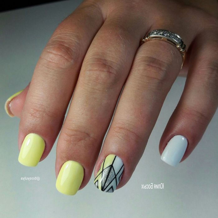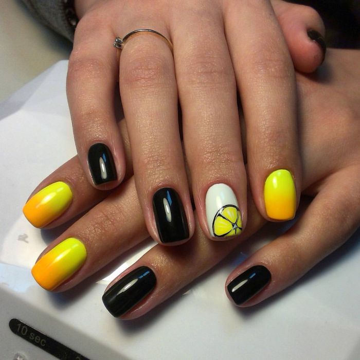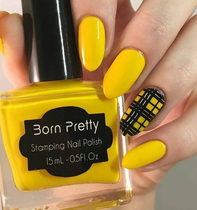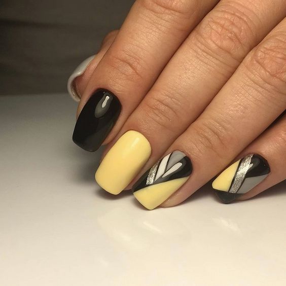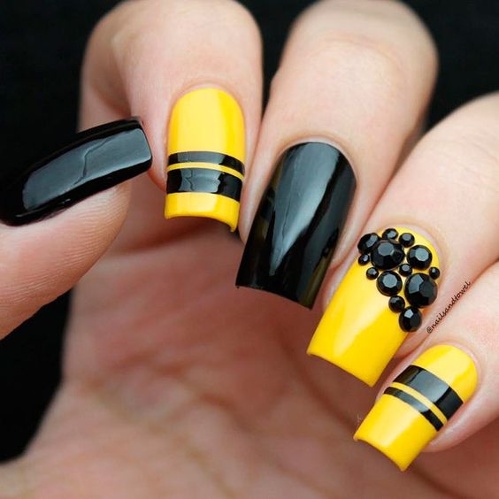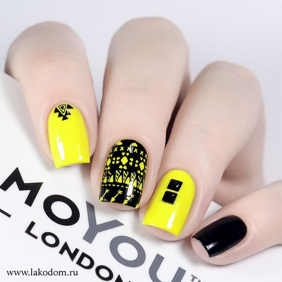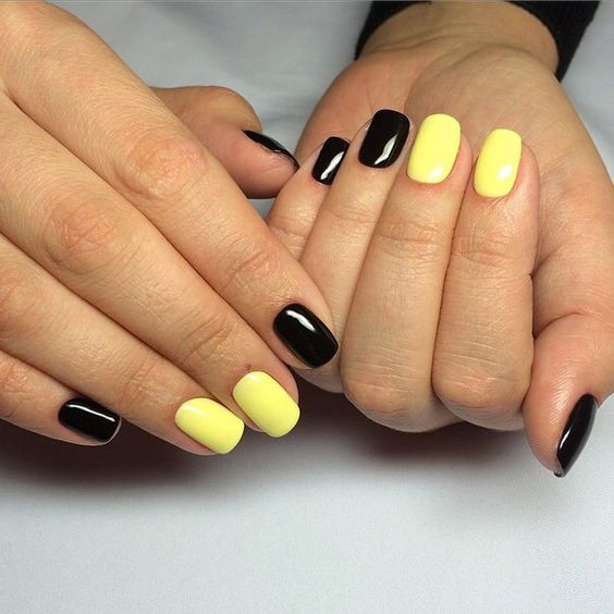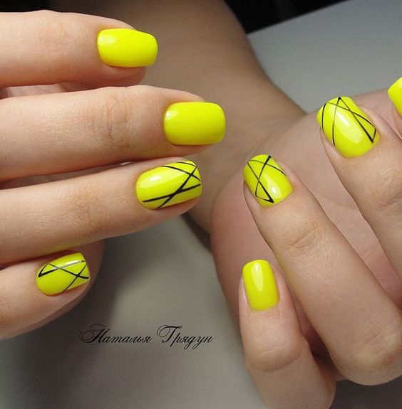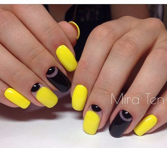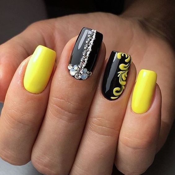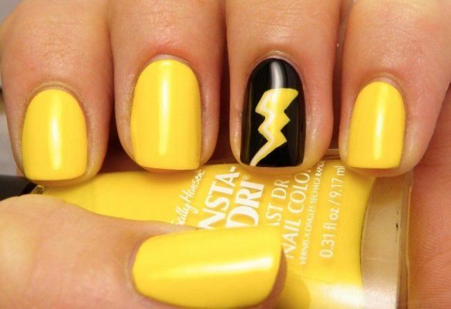 Pour créer une manucure brillante et efficace, vous devez choisir les bonnes couleurs. La combinaison du noir et du jaune est parfaite pour cela. Mais en fonction de la nuance de jaune, vous pouvez rendre le dessin à la fois léger, délicat, du soir ou même strict. Bien sûr, le rôle est joué par un décor supplémentaire, ainsi que par la présence d'un motif sur les ongles.