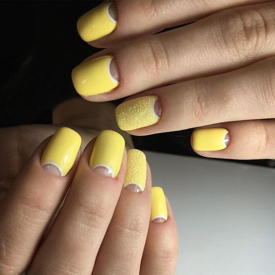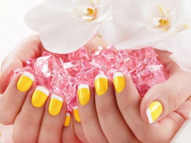 Assez souvent, les filles choisissent une teinte blanche et jaune pour créer une manucure à la française ou au clair de lune. Dans cette performance, il a l'air plus féminin et en même temps enjoué.