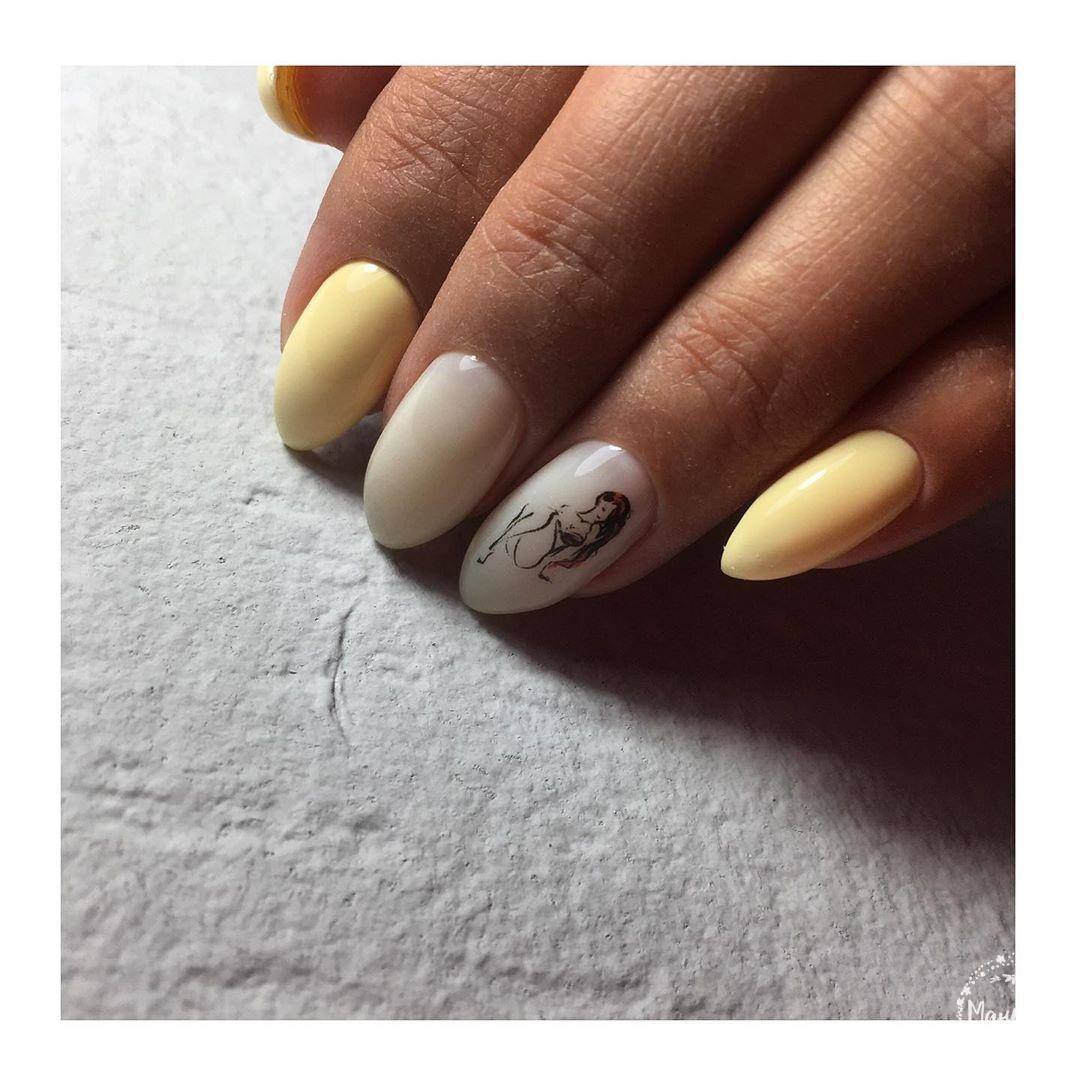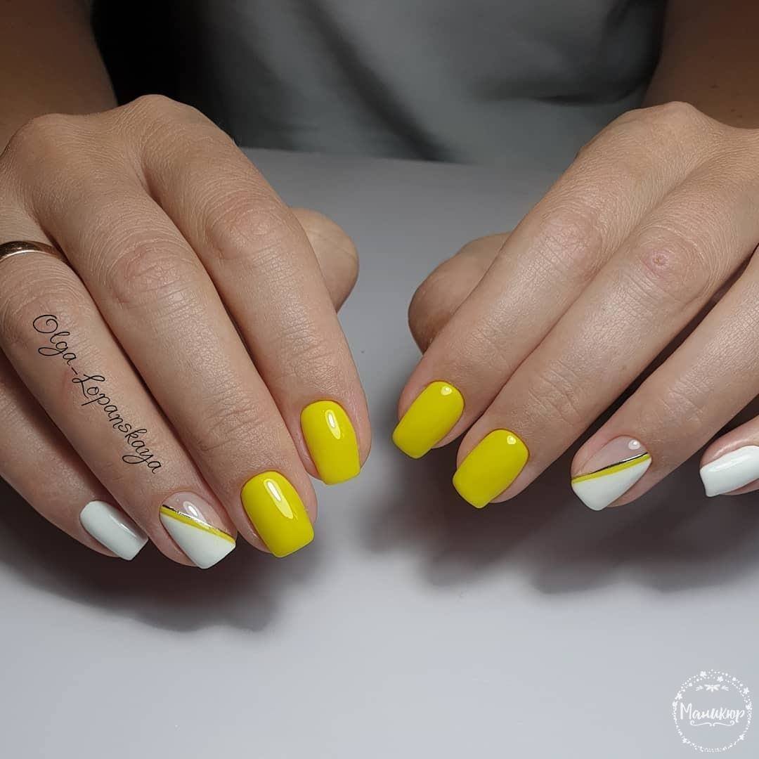 La combinaison de jaune et de blanc est particulièrement belle et douce. Par conséquent, il est utilisé assez souvent et est incroyablement apprécié par les filles. Souvent, une telle manucure est réalisée dans des couleurs unies, mais avec l’ajout d’un décor, un tel nail art a l’air encore plus charmant.Les petits strass vont devenir la meilleure décoration. Une autre option sophistiquée sera un dessin sur un ou plusieurs ongles. Très souvent, ces couleurs sont utilisées pour la manucure lunaire ou française. Cette performance a l'air incroyablement féminine et enjouée.