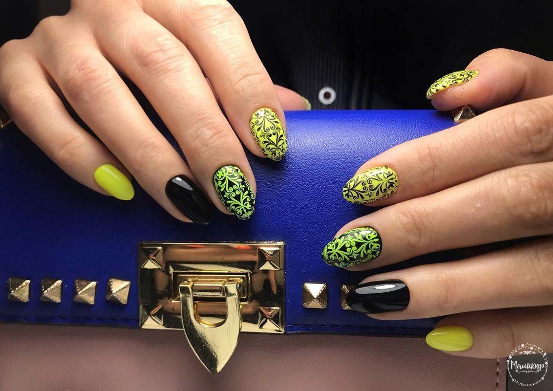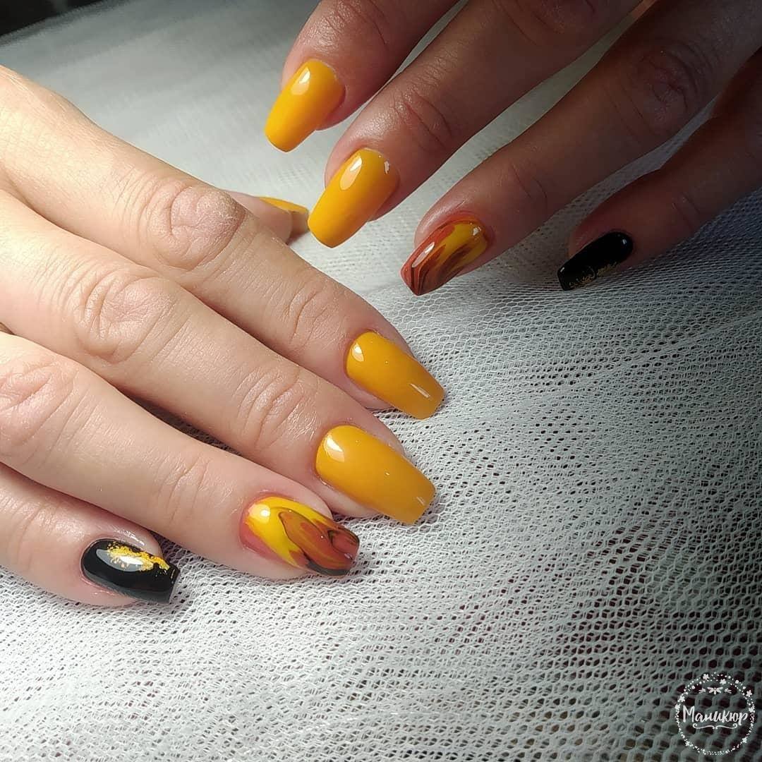 Tout d'abord, pour effectuer une manucure spectaculaire, vous devez choisir le bon ton. La combinaison du noir et du jaune est parfaite. Selon le ton du jaune, vous pouvez réaliser un dessin doux, austère, léger ou du soir. Un décor important, la présence de dessins et leur style jouent un rôle important. Le plus souvent, un tel nail art est choisi pour la période automnale. Cela est dû au fait qu'il s'intègre parfaitement dans la garde-robe de la saison. En ce qui concerne le motif, choisissez une dentelle raffinée, des fleurs délicates ou un motif géométrique à la mode. Chacune des options donnera un certain caractère à la manucure.