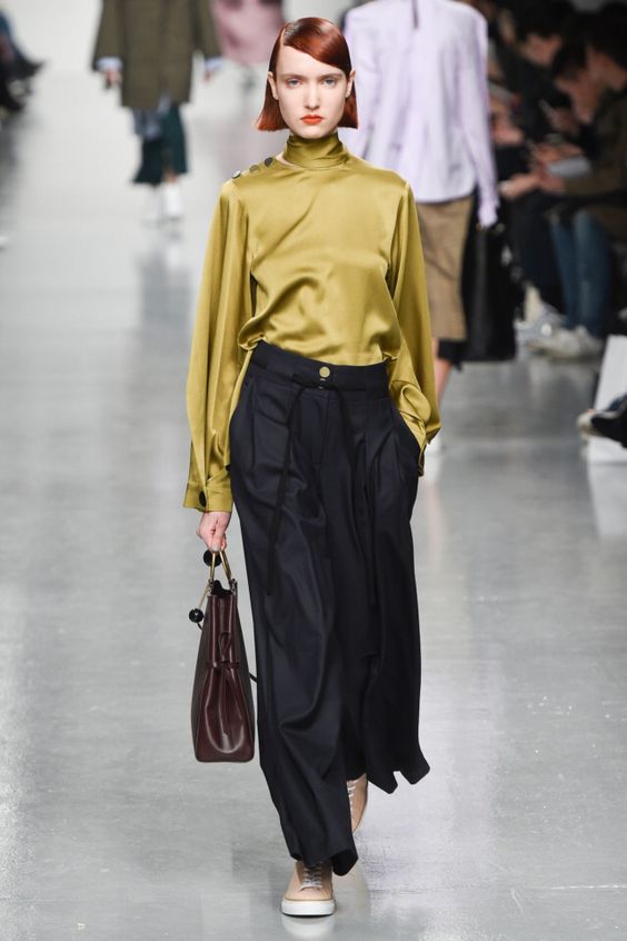 Parmi les chemisiers élégants à la mode de cette saison seront des produits de satin et de soie. Ils ont l'air très sophistiqué, doux et féminin. En mettant une telle chose, chaque fille se sentira luxueuse. Pour rendre le look plus harmonieux, nous vous recommandons d'associer une blouse à un pantalon large ou à une jupe. Jeans ou pantalons skinny ne correspondent pas catégoriquement à une telle chose.